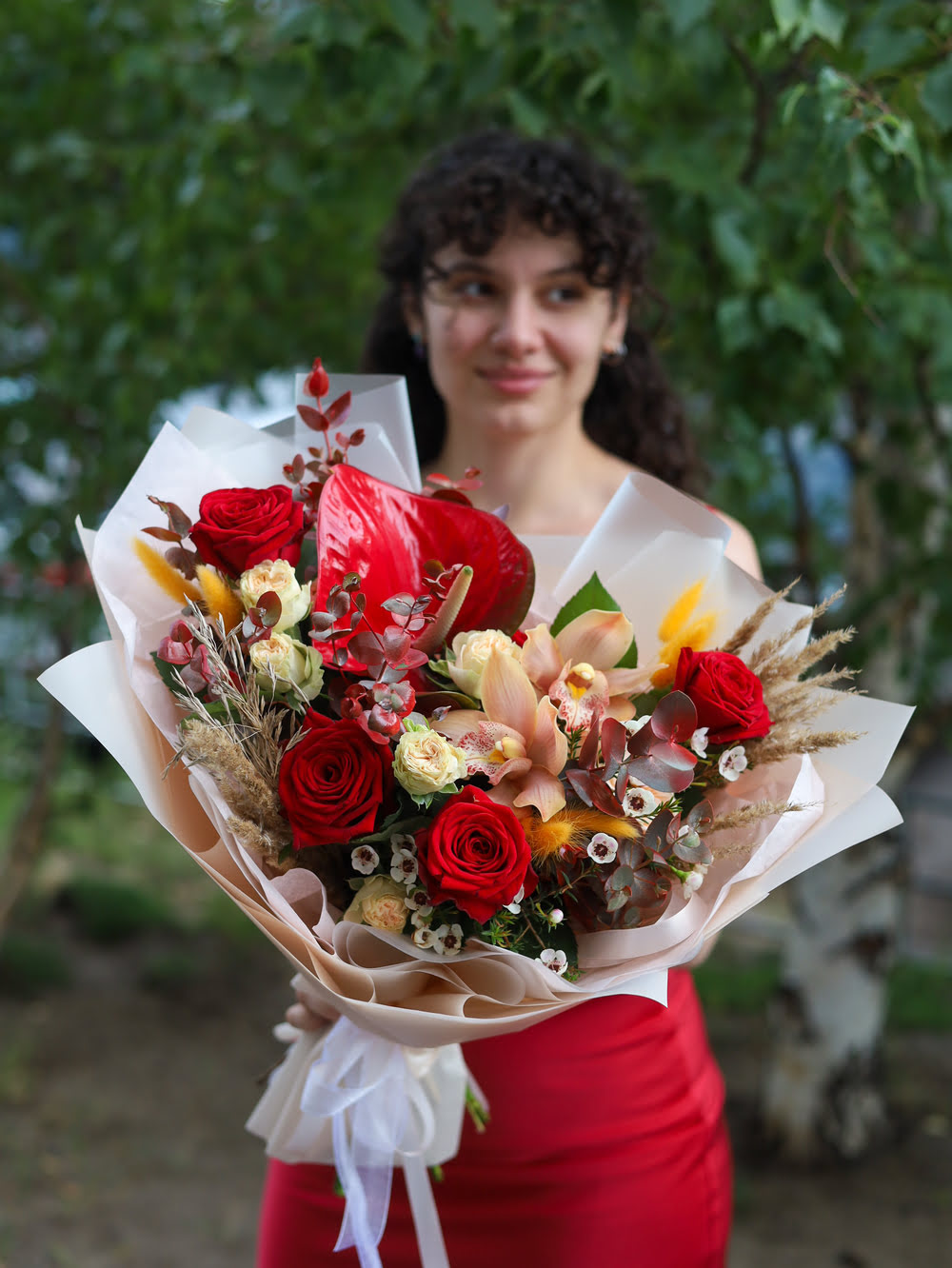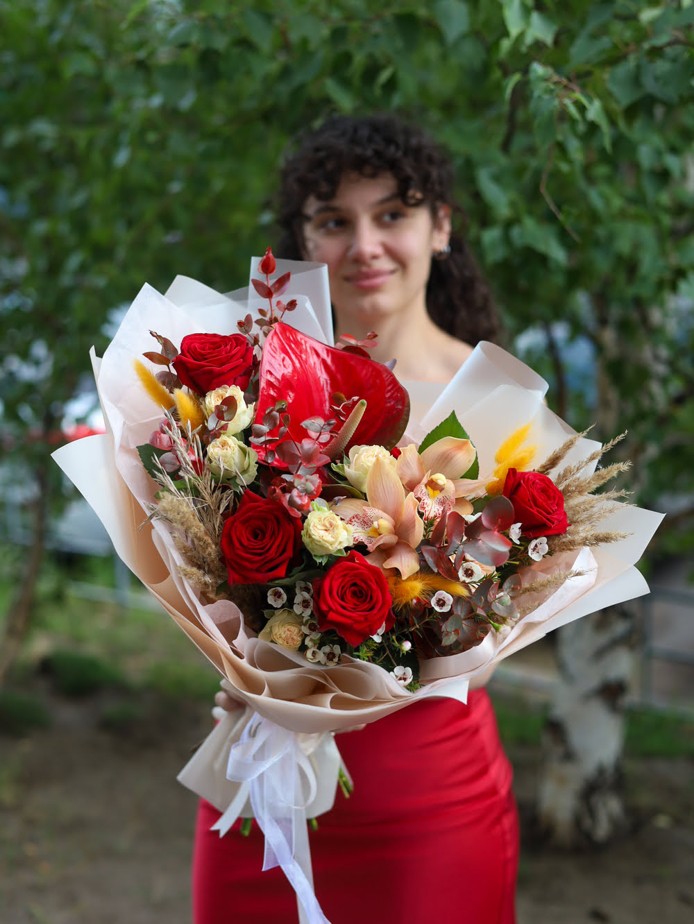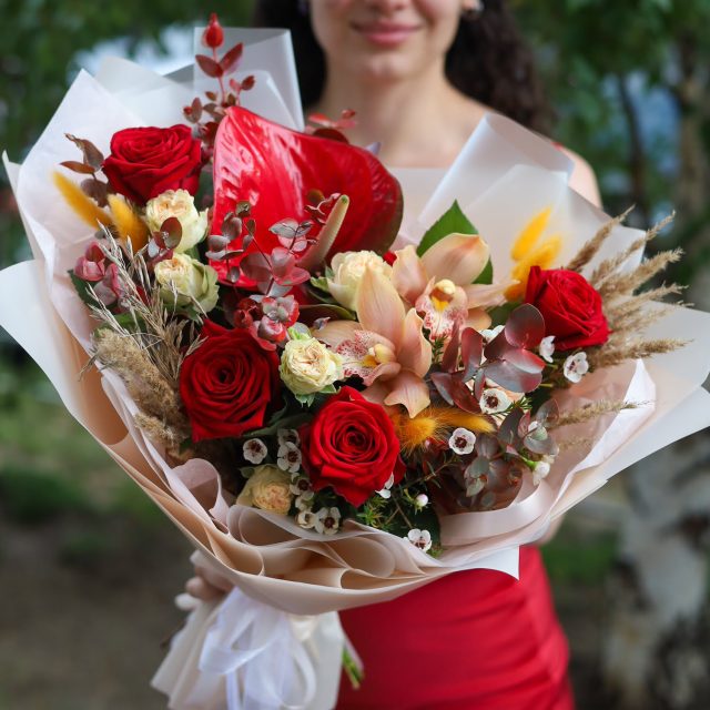 Состав: одноголовые розы, стойкие орхидеи, крупный антуриум, кустовые пионовидные розы, ароматный хамелациум, крашеный эвкалипт, разнообразные сухоцветы.