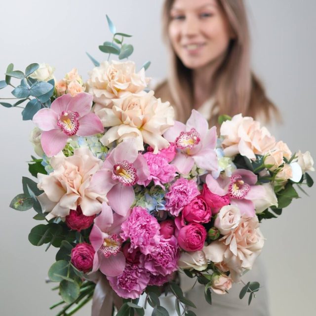 В букете: пышные гортензии, разнообразные розы: крупные французские, кустовые и одноголовые, к кустовые пионовидные; стойкие диантусы, ароматный эвкалипт.