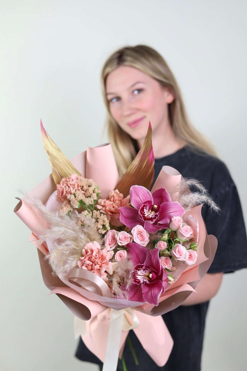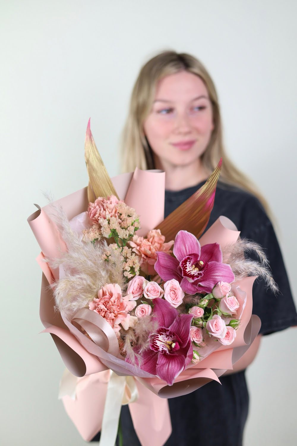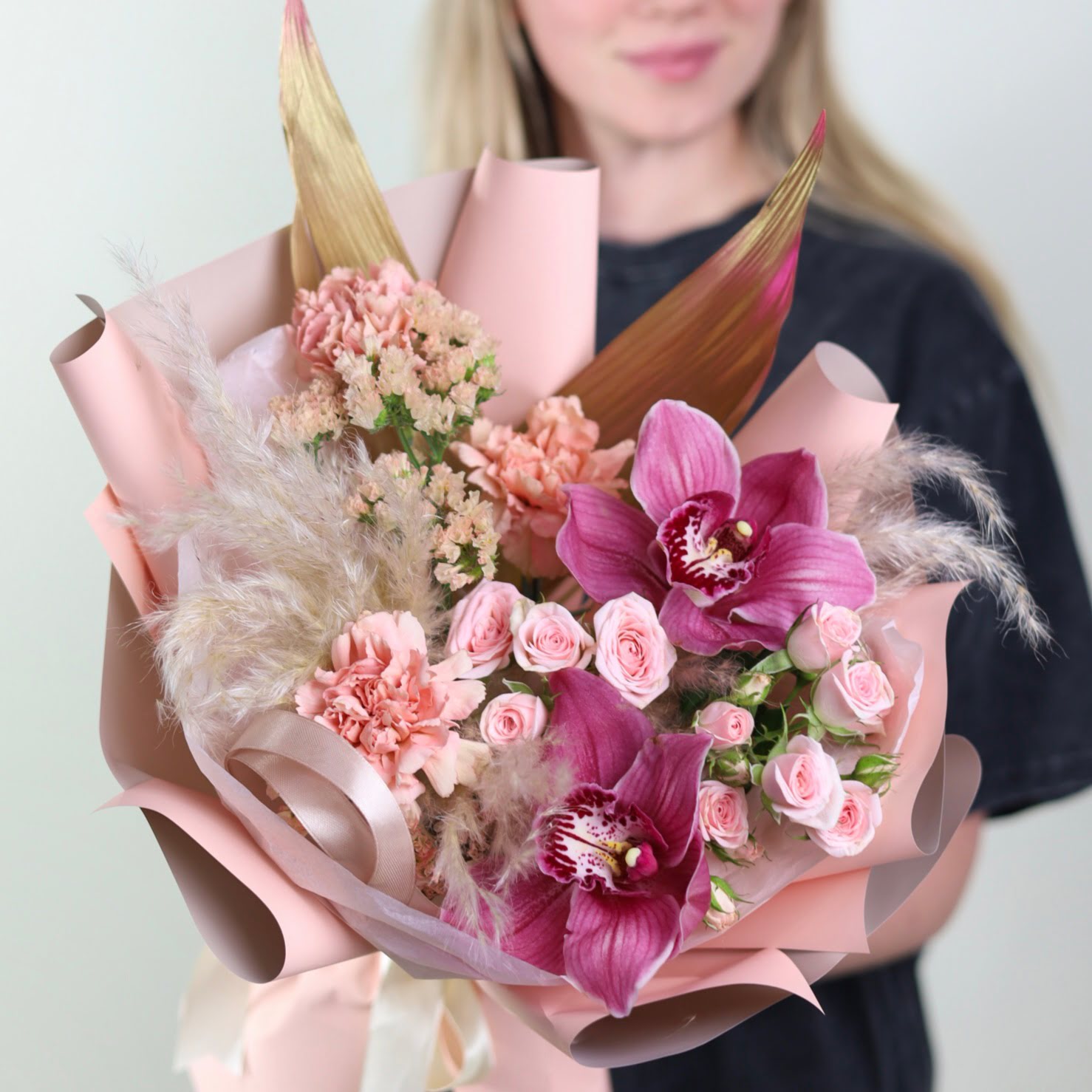 В букете: стойкие орхидеи и диантусы, кустовые розы, статица, сухоцветы, декоративные элементы.