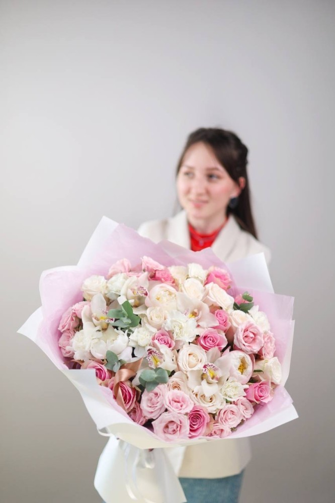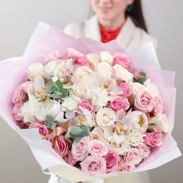 В букете: пионы, стойкие орхидеи и диантусы, кустовые розы, разнообразные одноголовые розы, душистый эвкалипт.