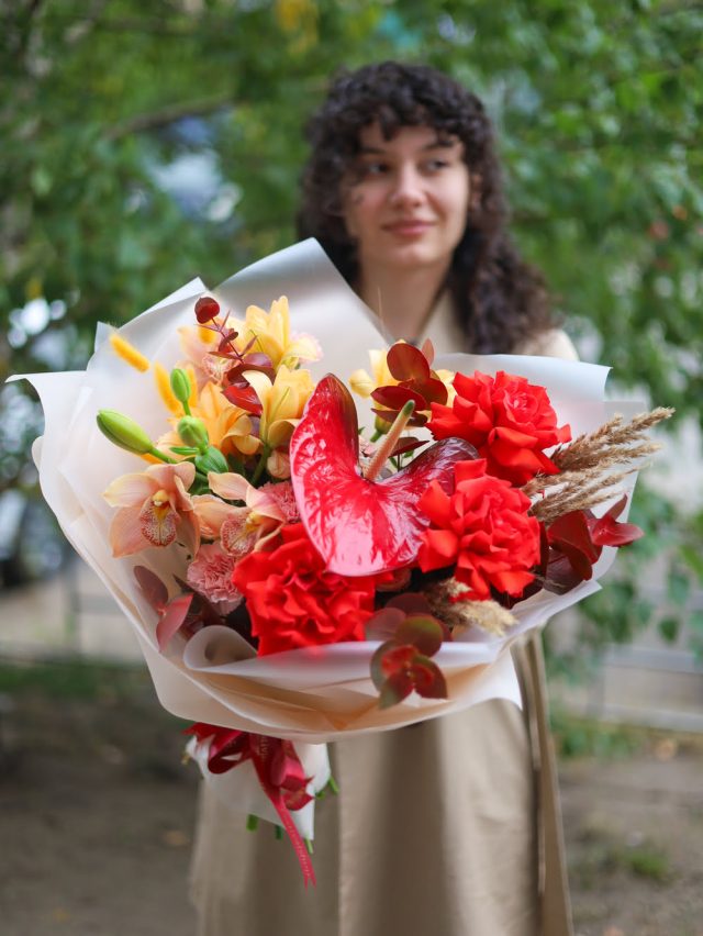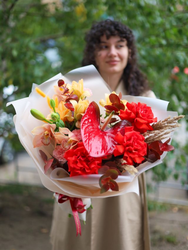 Состав: крупный антуриум, французские розы, стойкие диантусы и орхидеи, ароматные лилии, сухоцветы, крашеный эвкалипт.