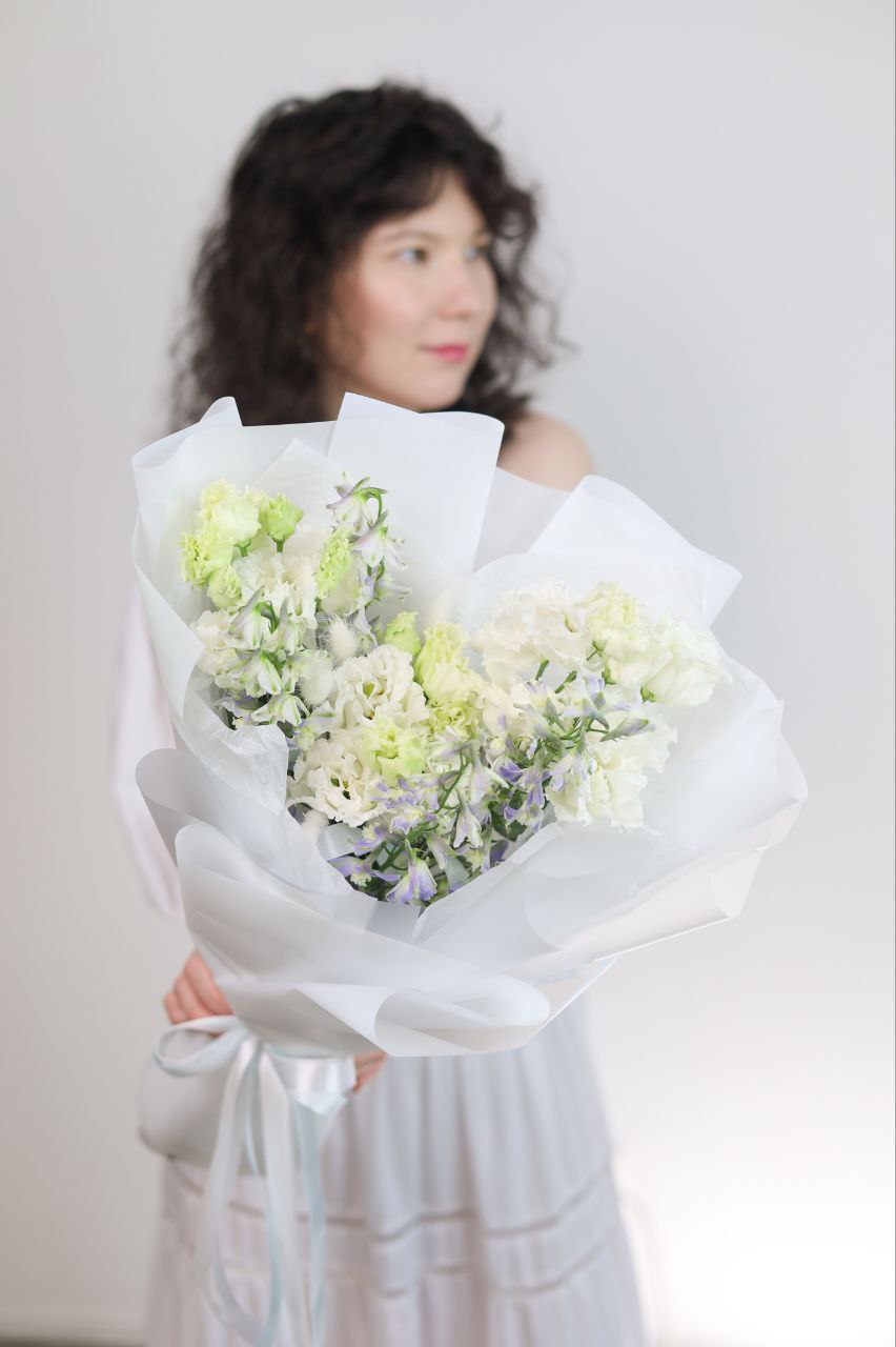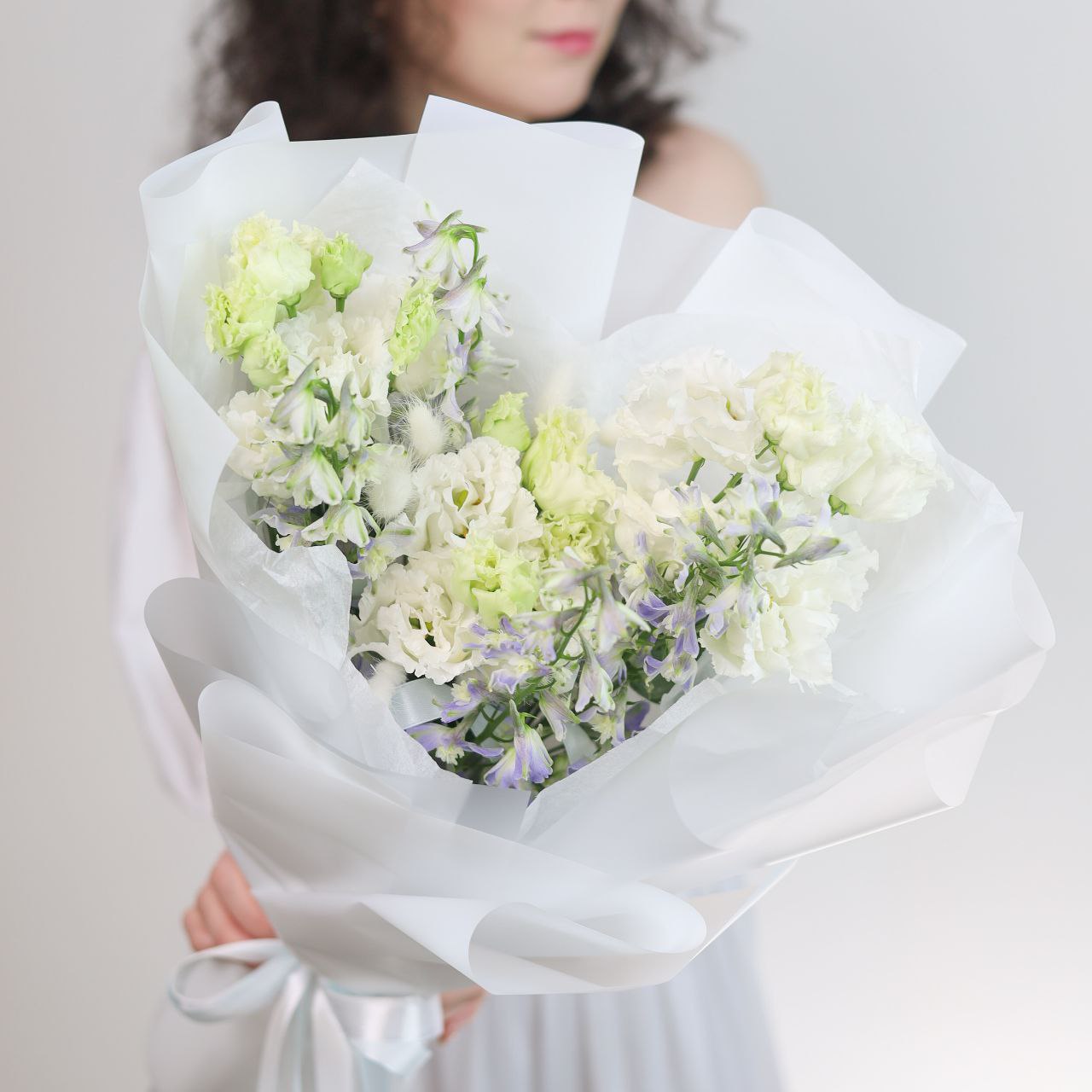 Красивый букет с ажурной эустомой и дельфиниумом в оформлении.