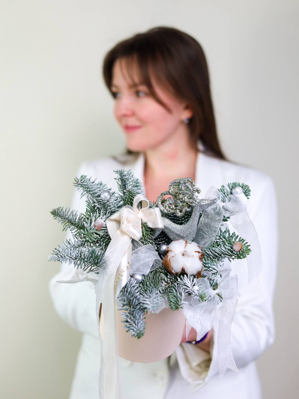 Композиция нобилиса, декоративных игрушек и хлопка в шляпной коробке.