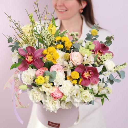 Роскошная композиция в пастельных оттенках, выполненная в шляпной коробке и украшенная атласными лентами.