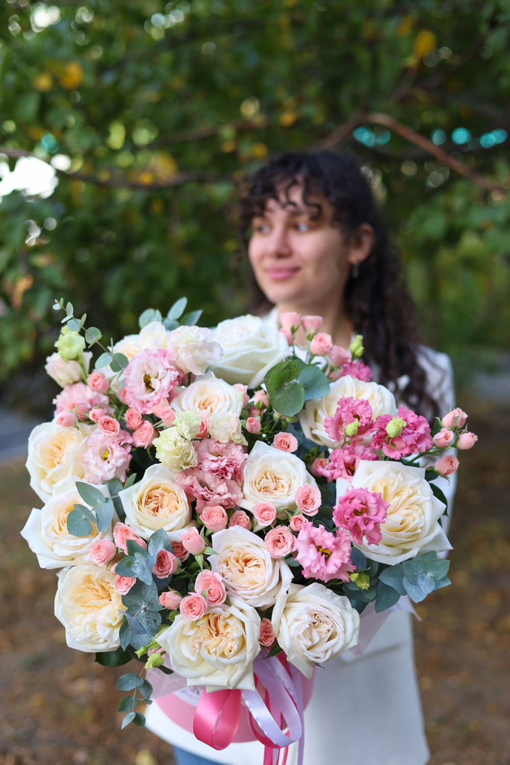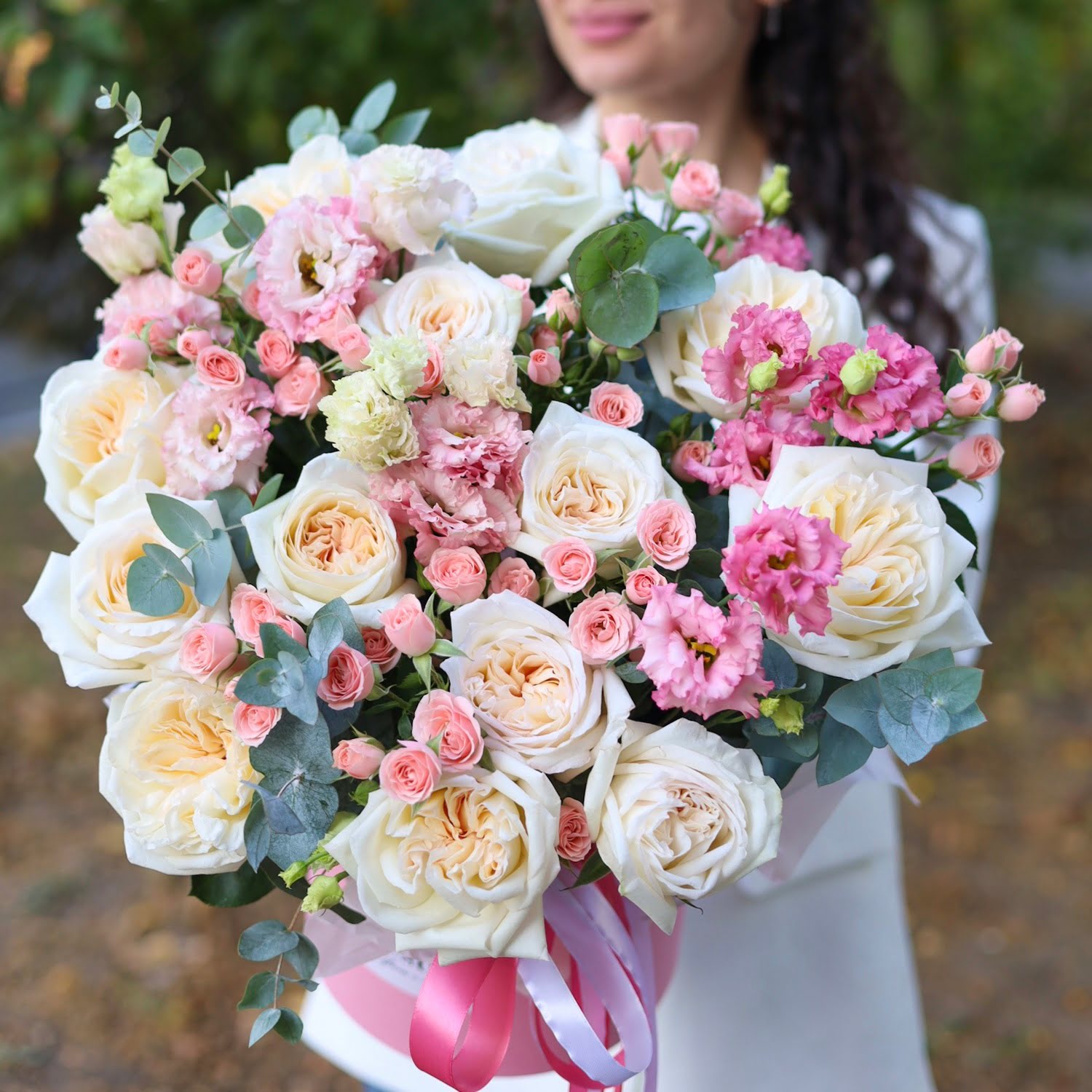 Состав: одноголовые пионовидные розы, ажурная эустома, кустовые розы, душистый эвкалипт.