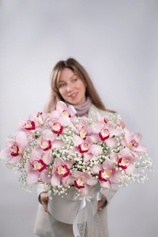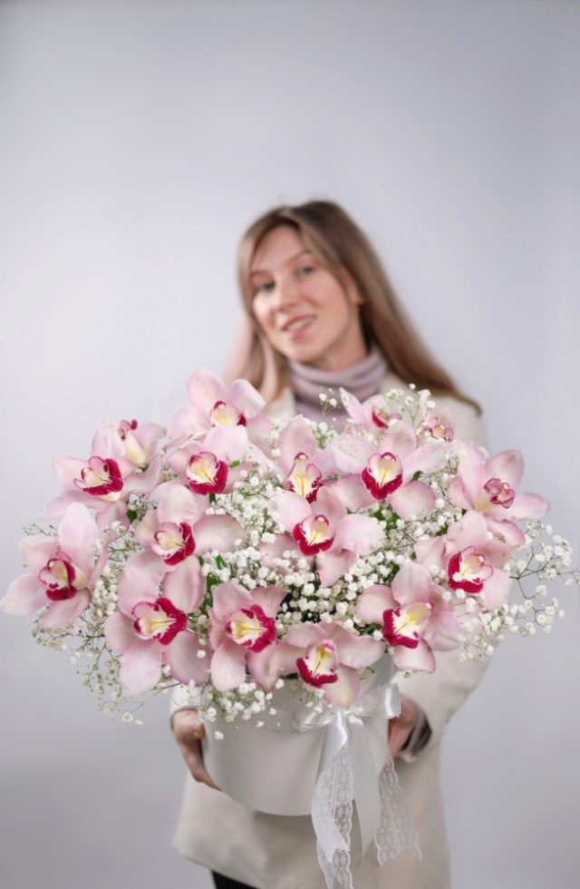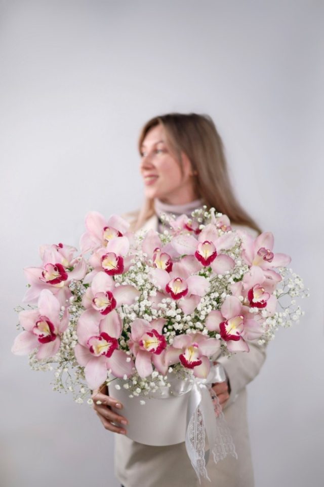 В композиции: орхидеи (15 шт.) и гипсофила. Гипсофила со временем высыхает и становится сухоцветом.