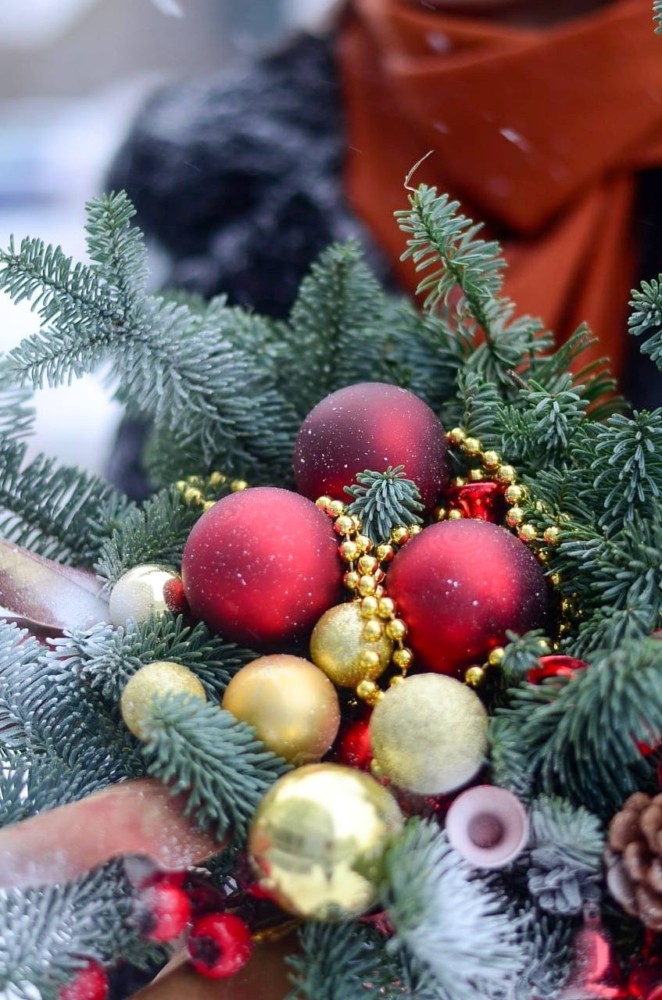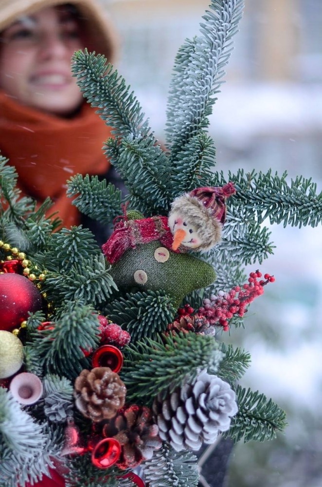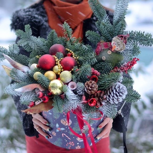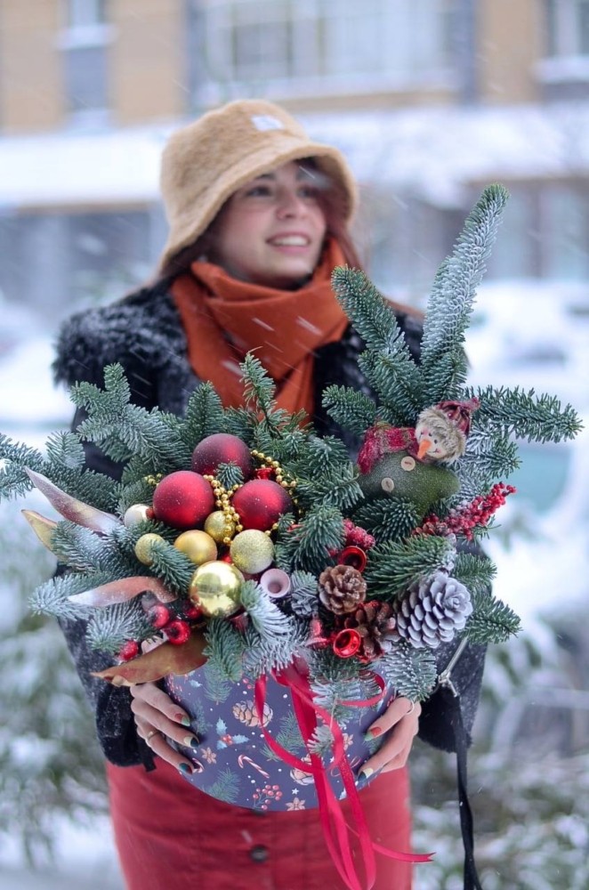 Большая композиция с ярким праздничным декором, шишками, нобилисом, илексом, листьями магнолии и очаровательным снеговиком в шляпной коробке. Высота около 40 см.