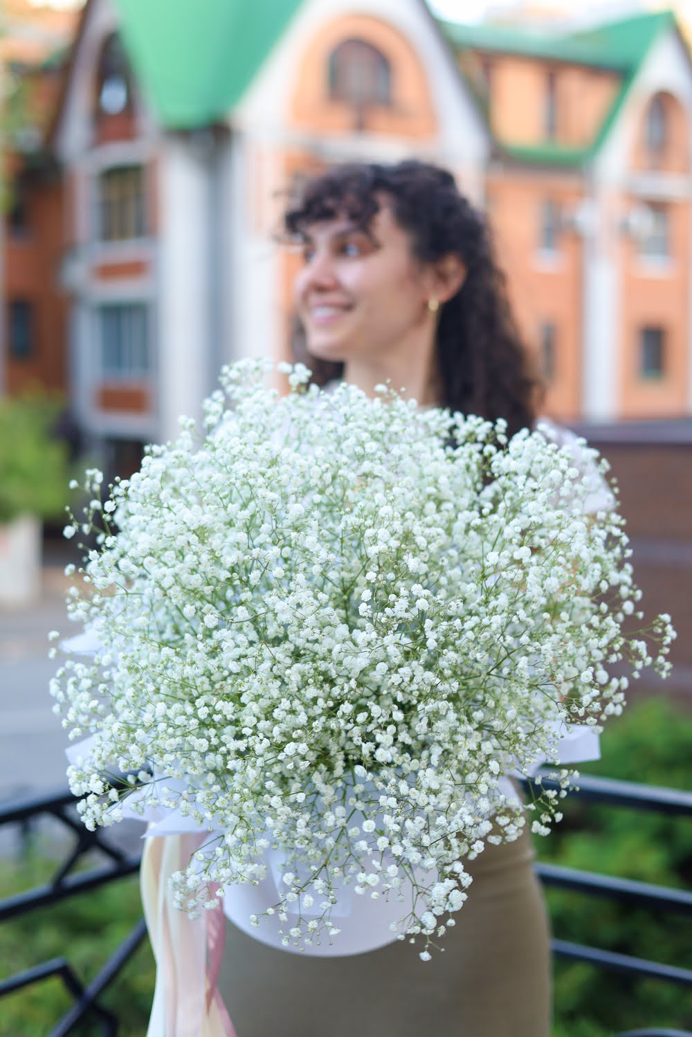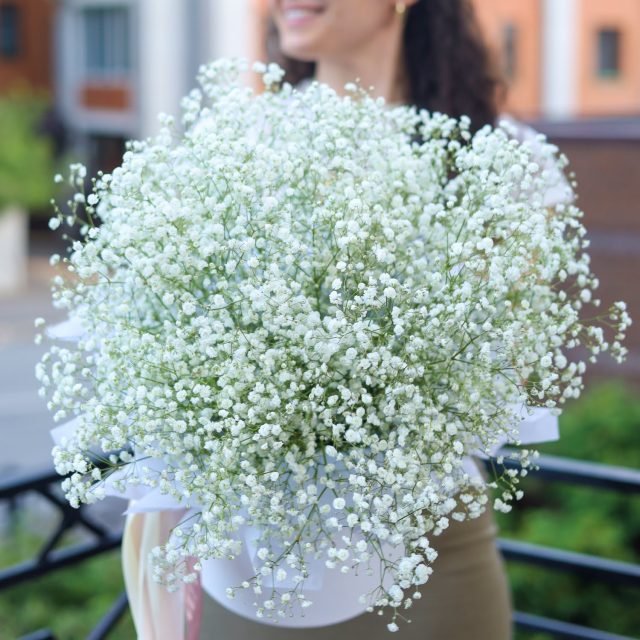 Великолепная объемная композиция нежной белой гипсофилы в шляпной коробке.