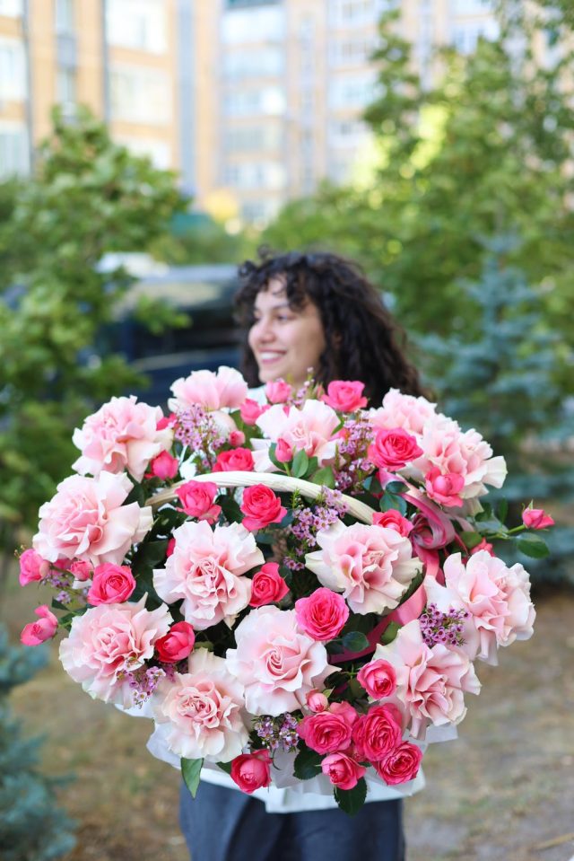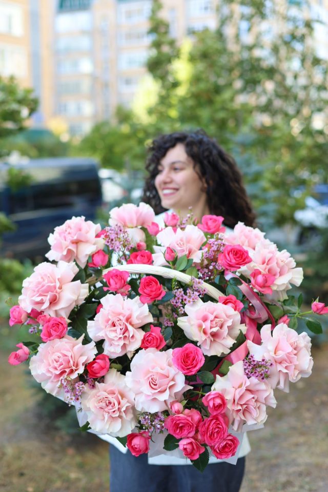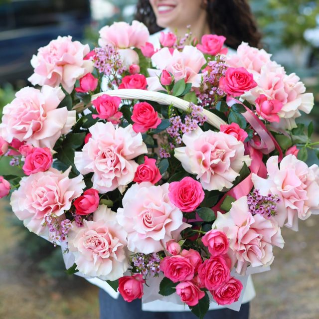 Прекрасная композиция с крупными французскими розами, кустовыми розами и ароматным хамелациумом в плетеной корзине.