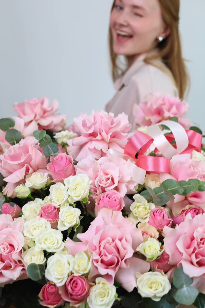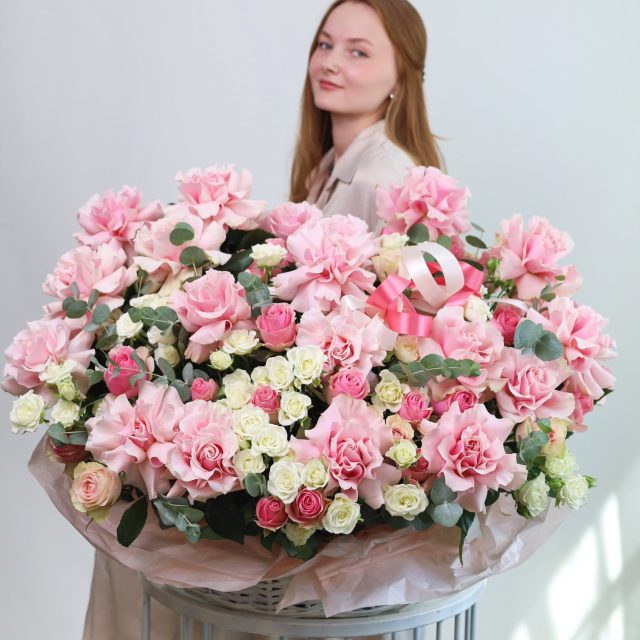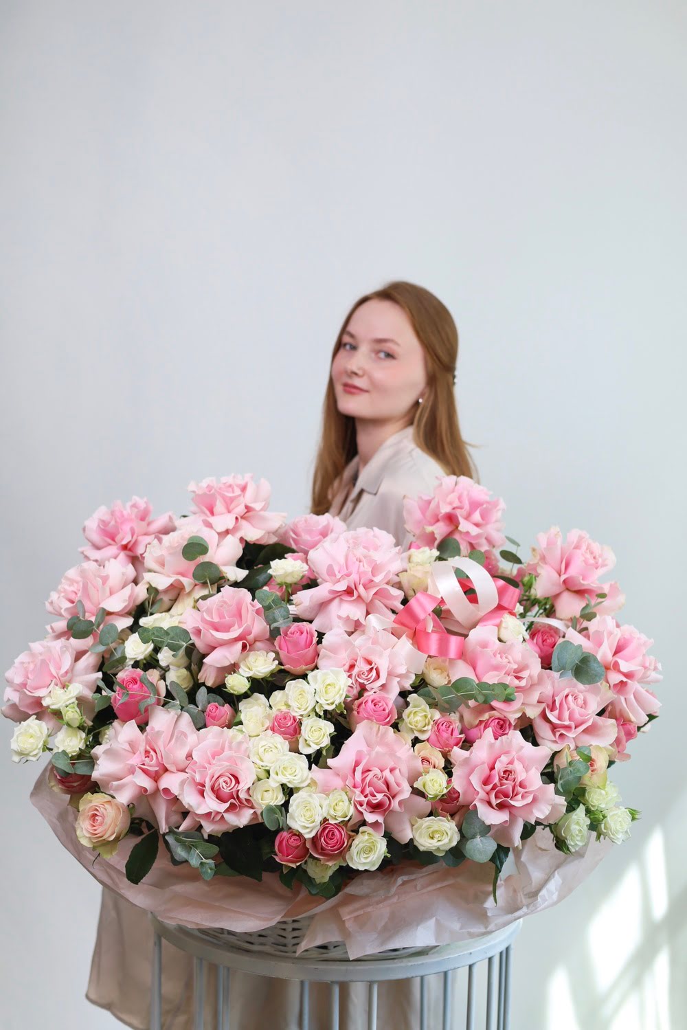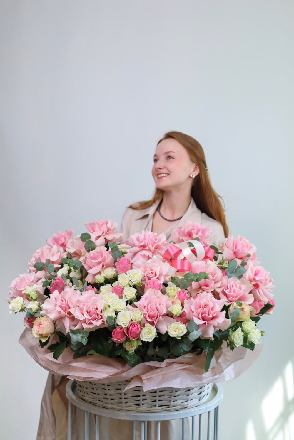 В корзине: французские розы, одноголовые и кустовые розы, душистый эвкалипт.