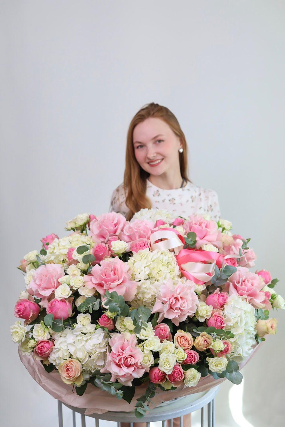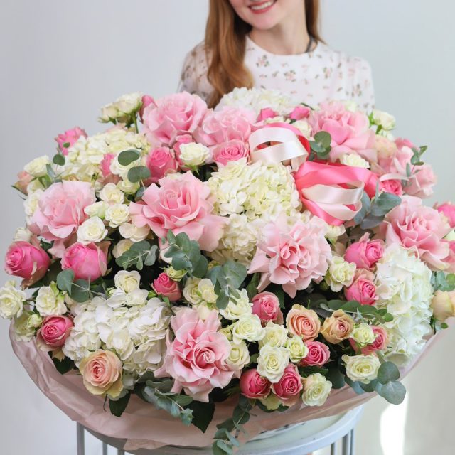 Состав: пышные гортензии, французские розы, кустовые и одноголовые розы, душистый эвкалипт.