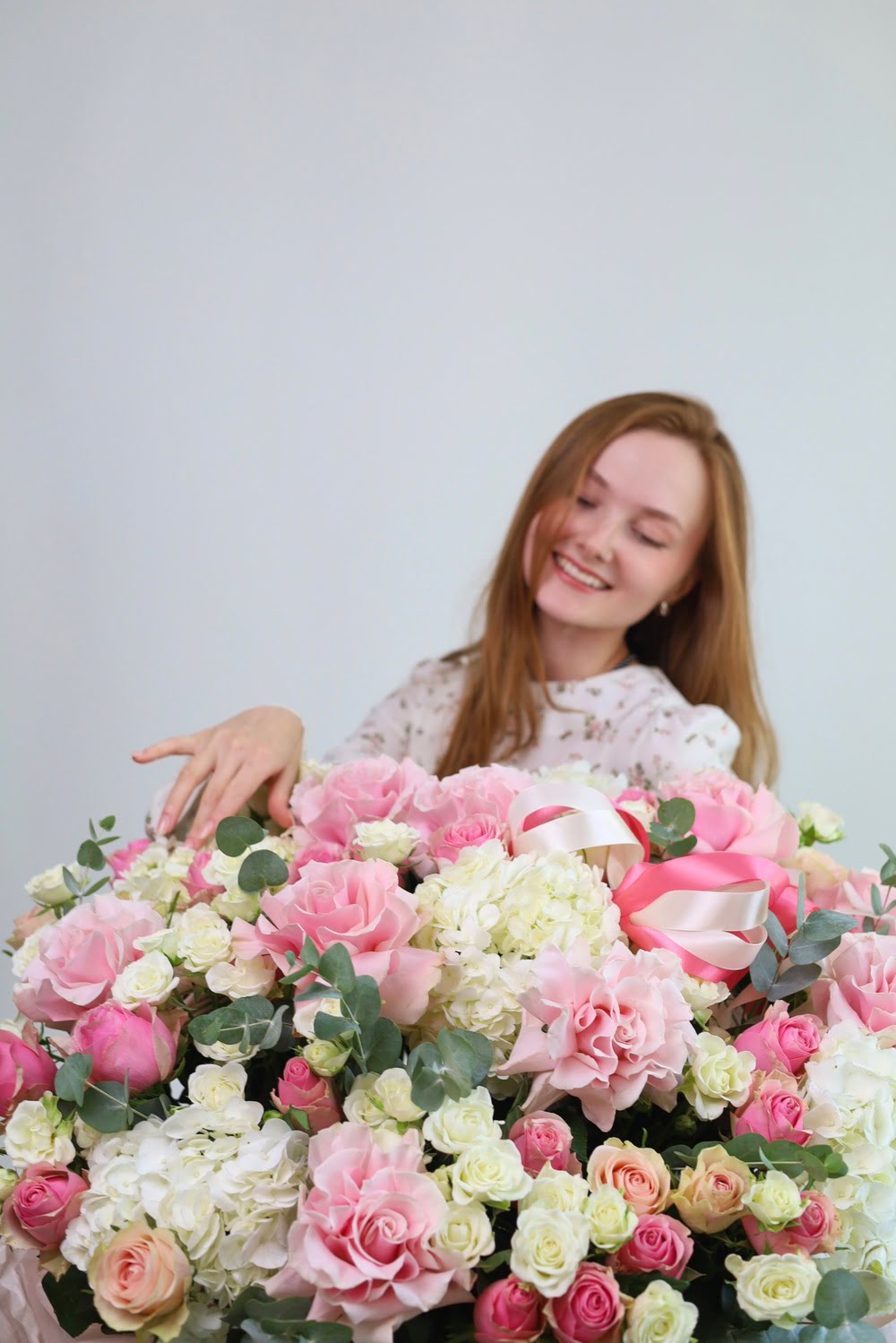 Прекрасная авторская композиция в нежной бело-розовой гамме в плетеной корзине.