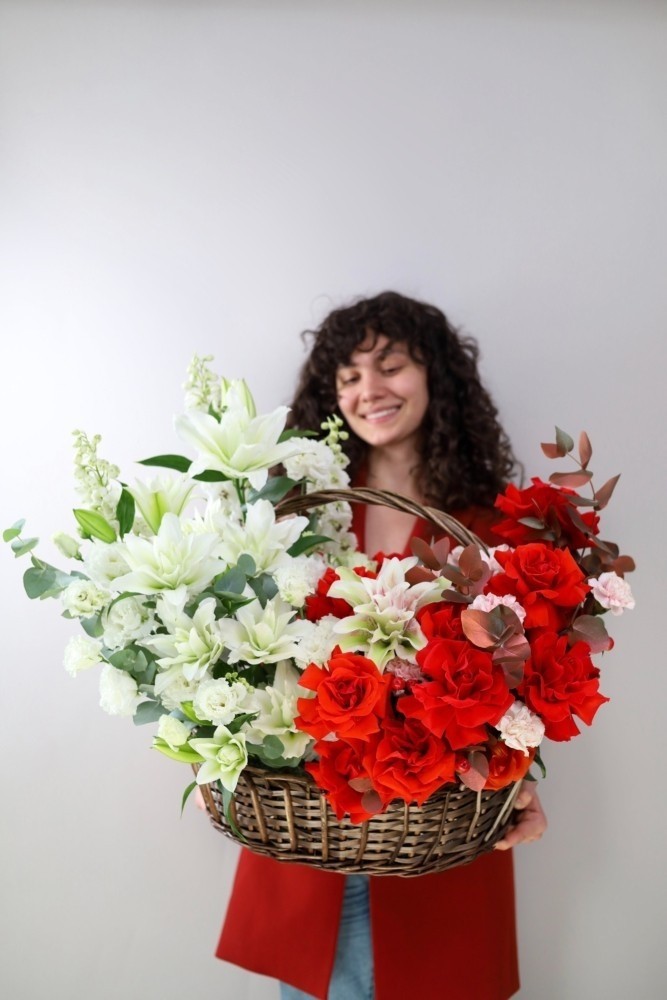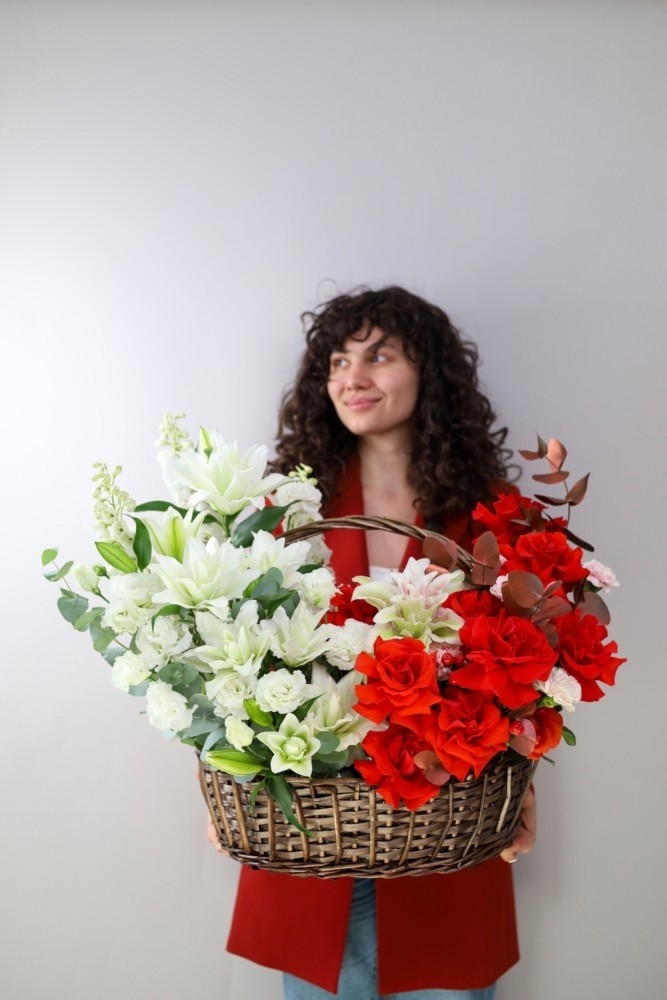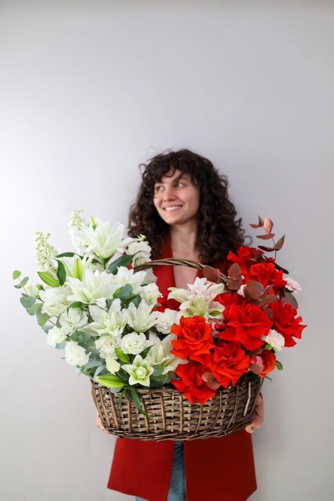 Великолепная большая композиция в контрастной гамме с ароматными цветами. Композиция выполнена в плетенной корзине.