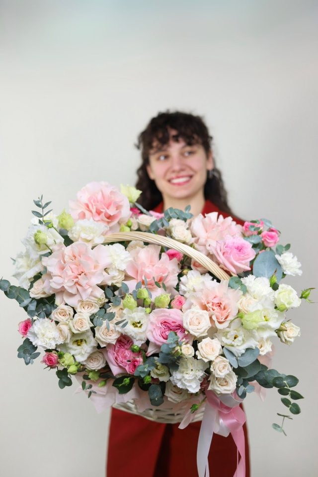 Роскошная корзина в нежной гамме в плетеной корзине.