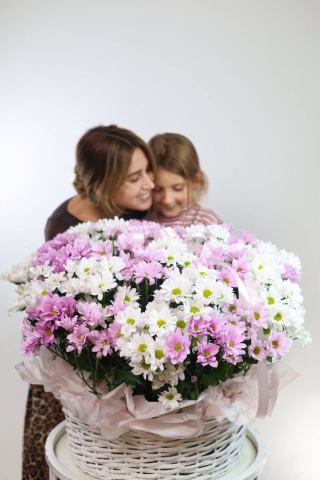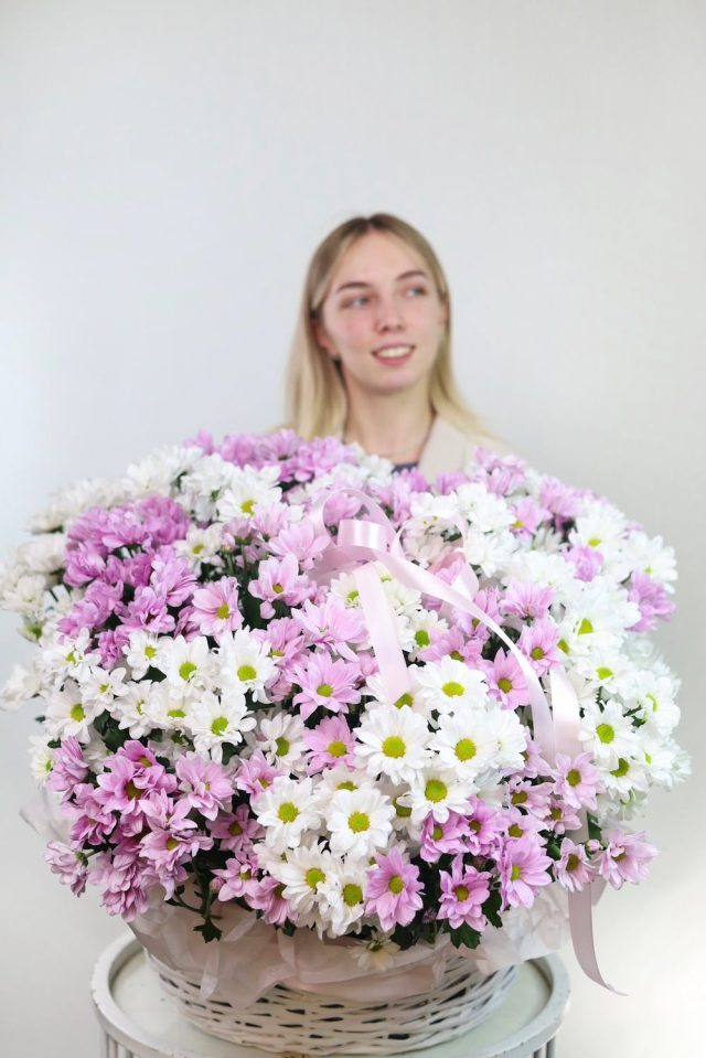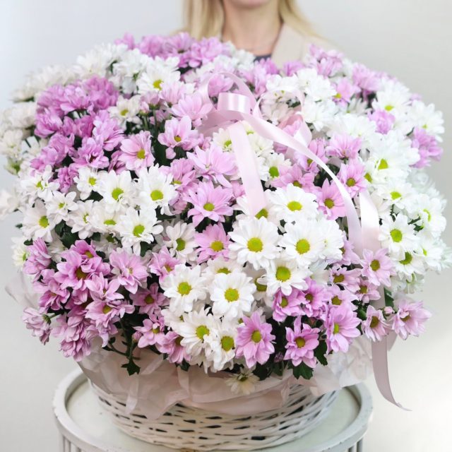 Такая корзина надолго оставит приятные впечатления не только из-за внешнего вида. При должном уходе хризантема способна радовать около 2-ух недель!