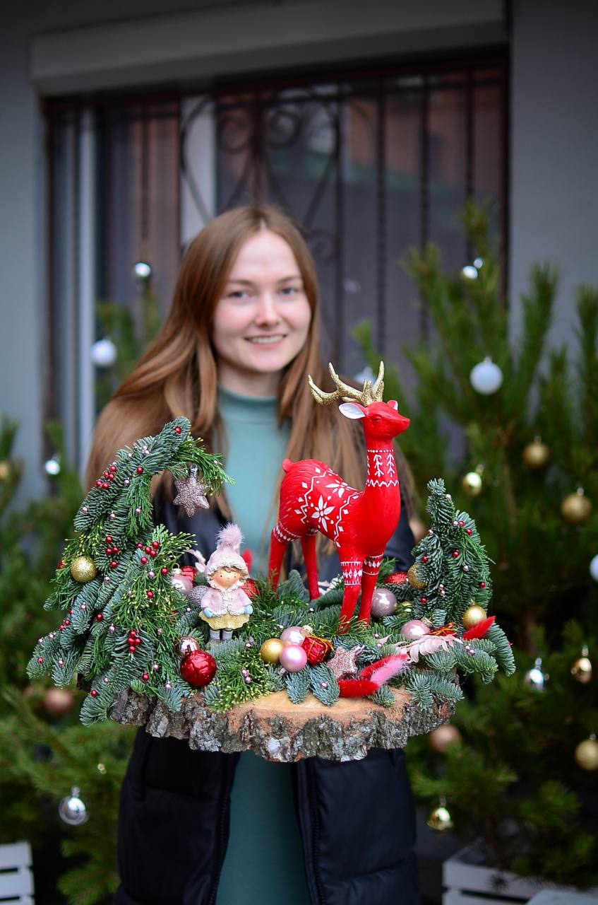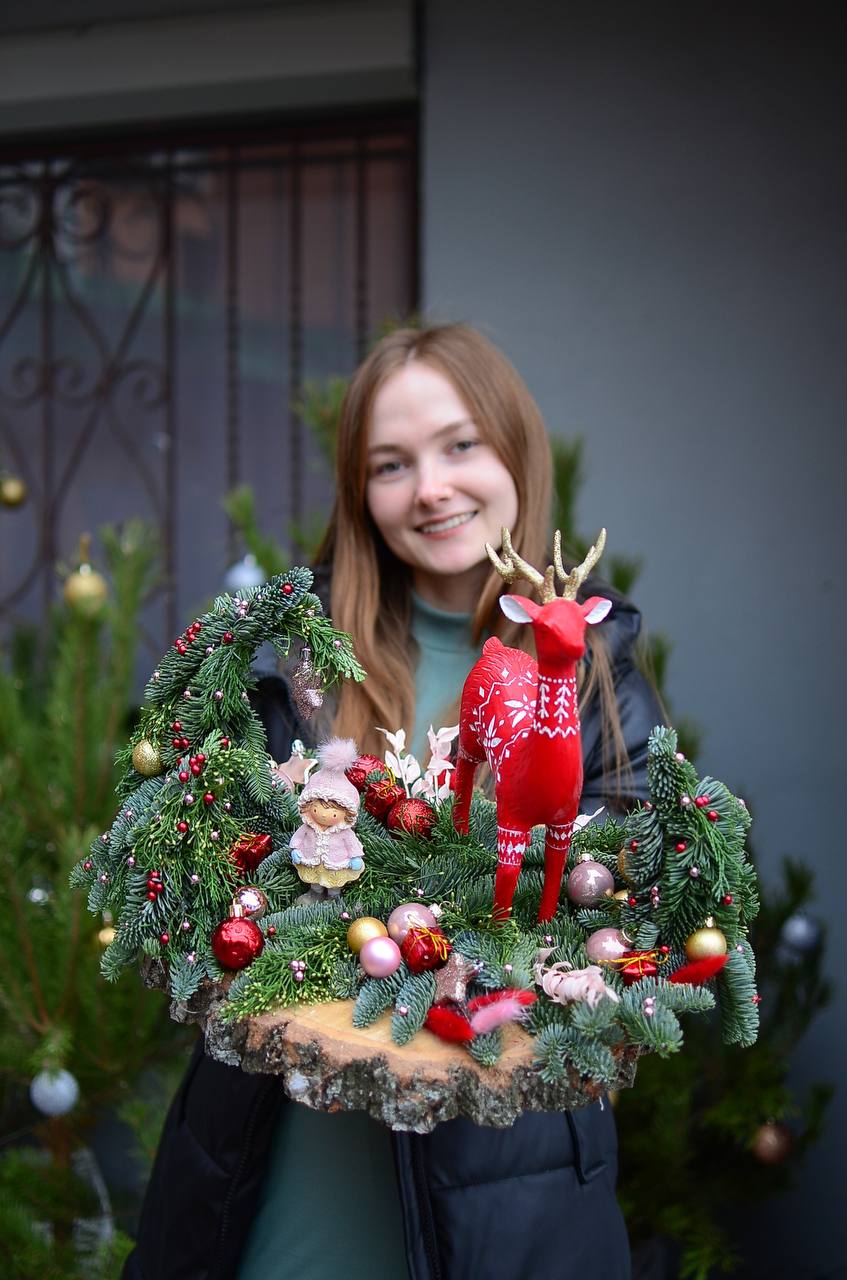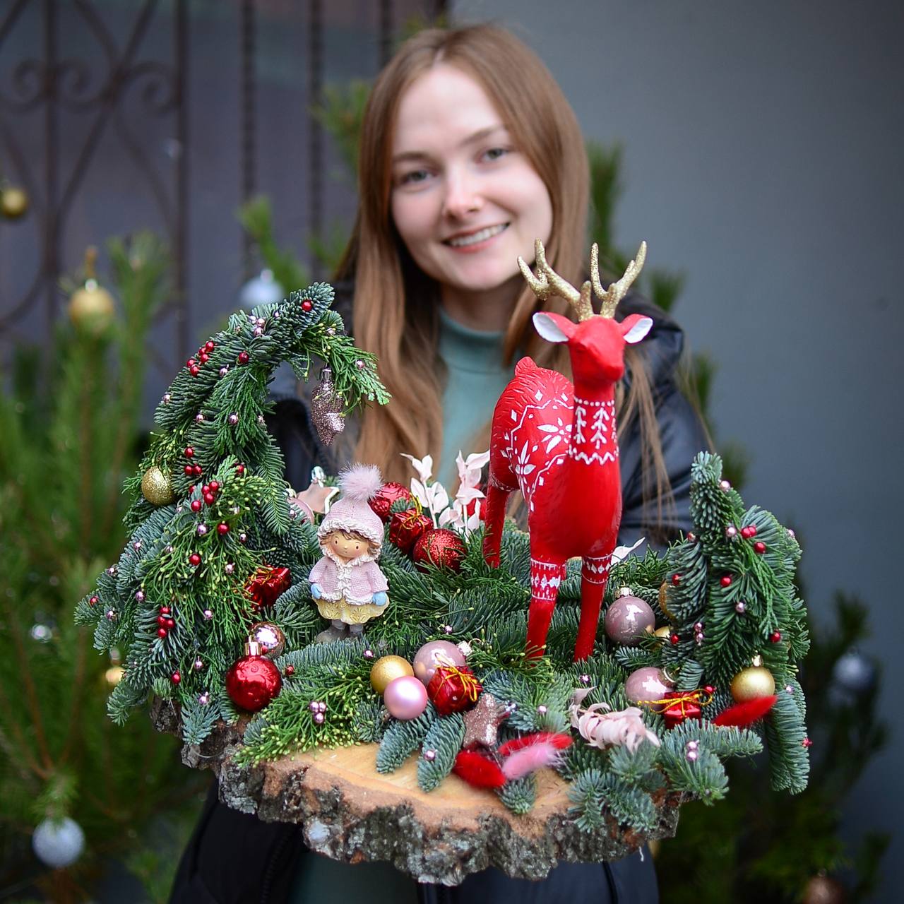 В композиции: нобилис, туя, новогодний декор, сухоцветы, куколка и фигурка оленя.