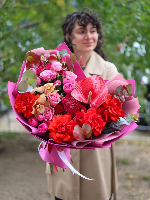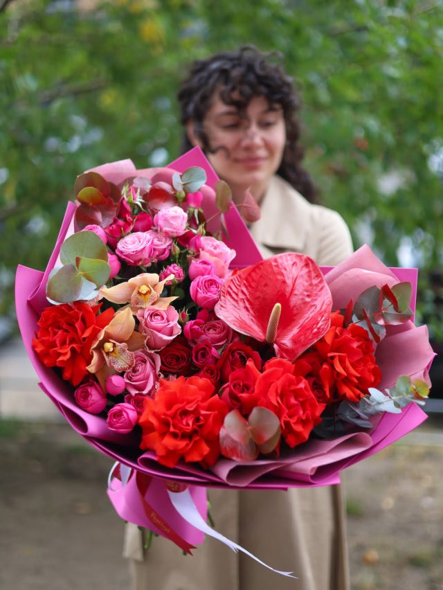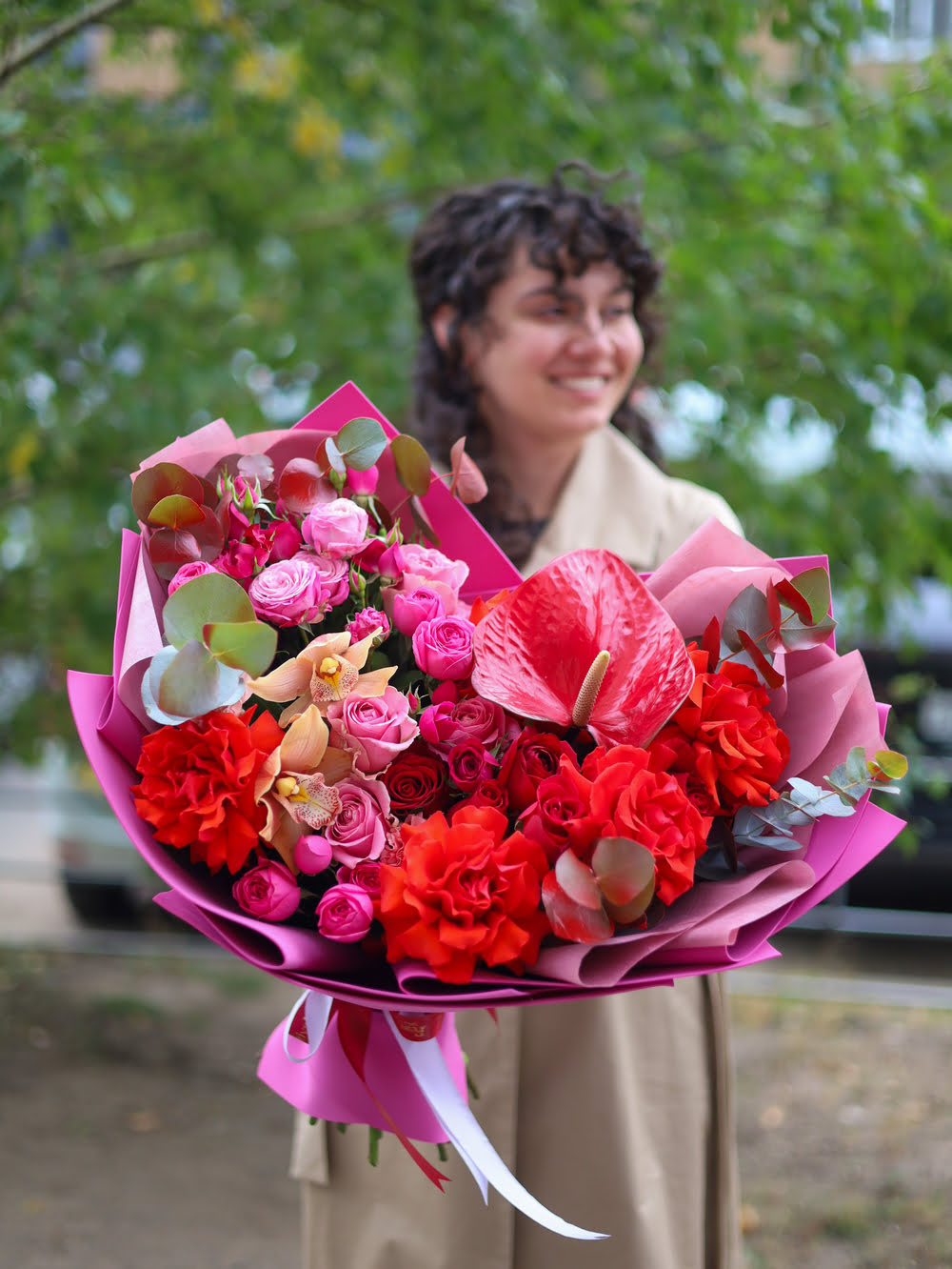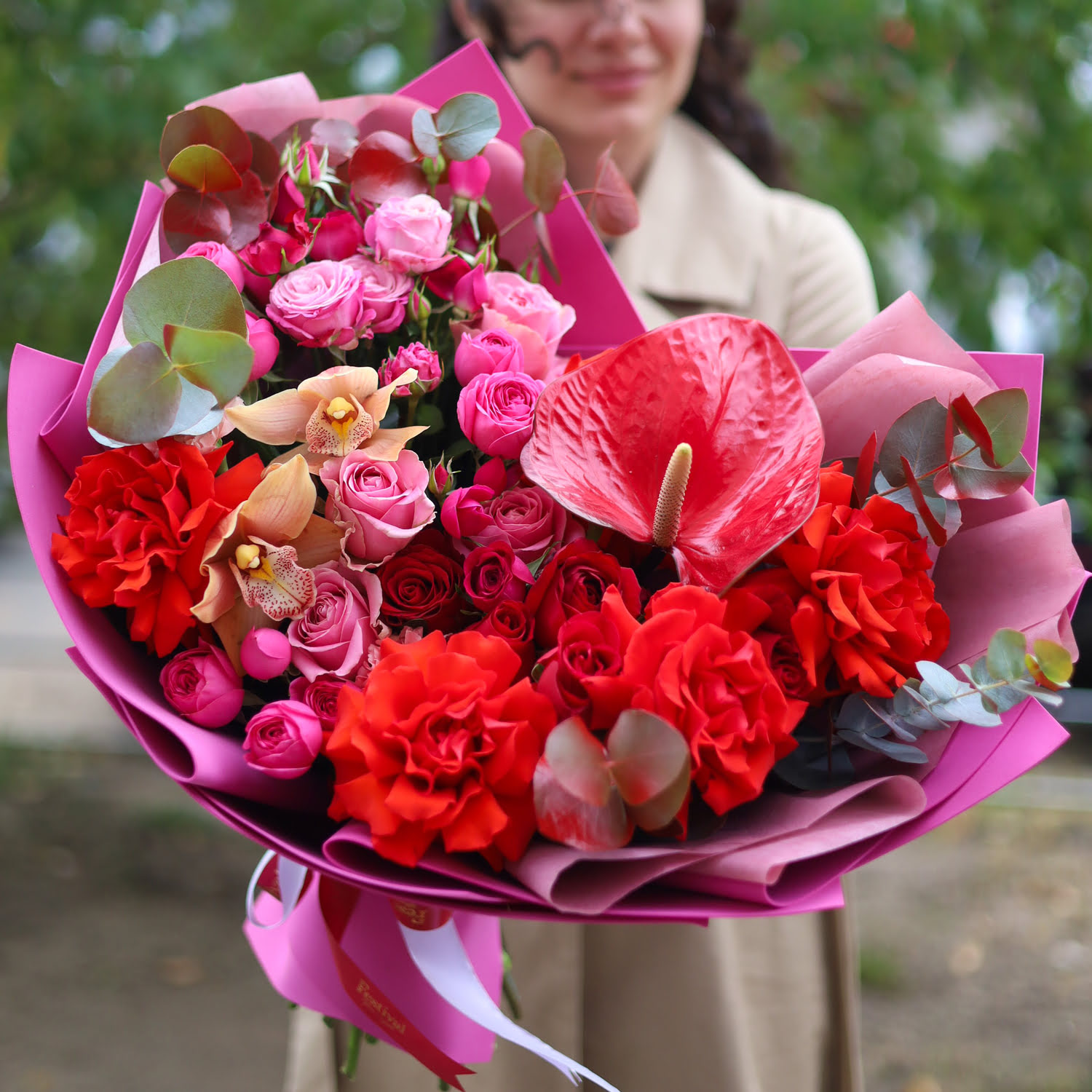 Состав: экзотический антуриум, крупные французские розы, стойкие орхидеи, кустовые и одноголовые розы, душистый эвкалипт.