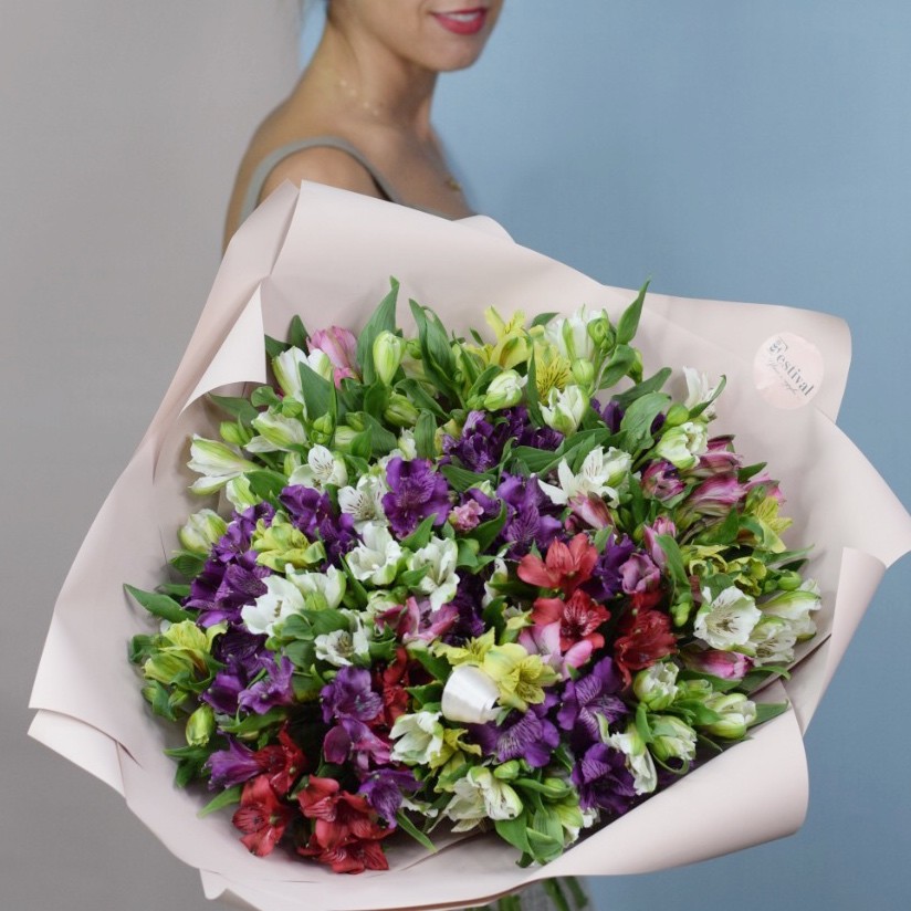 Красивый и очень стойкий букет из 51 альстромерии в оформлении. Цвет микс.