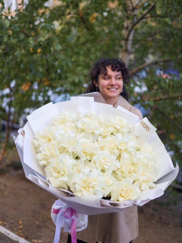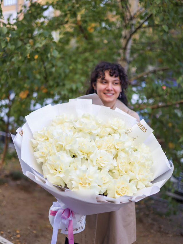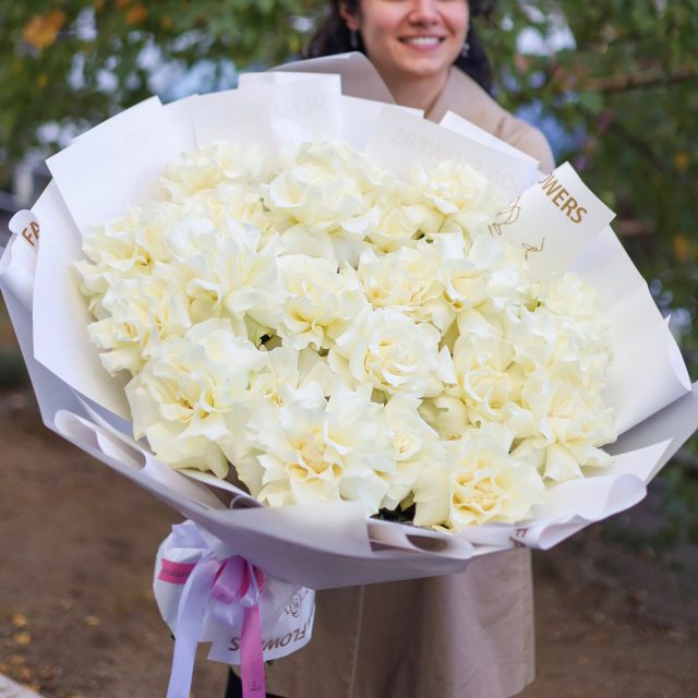 Роскошный букет из крупных французских роз белого цвета в стильном оформлении.