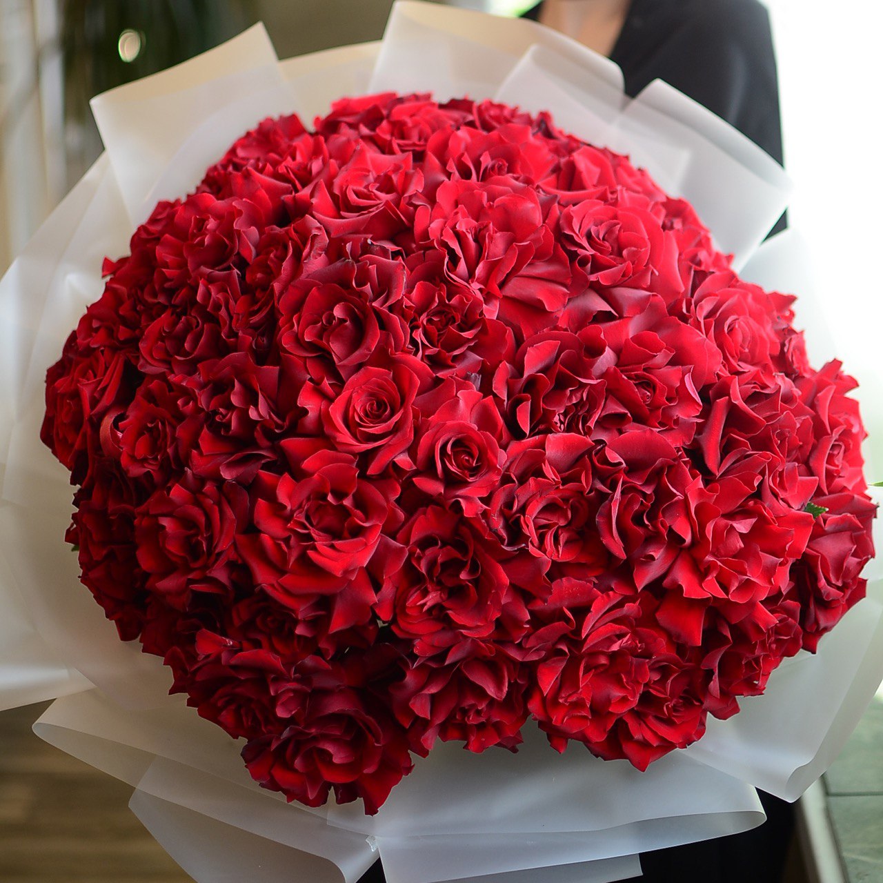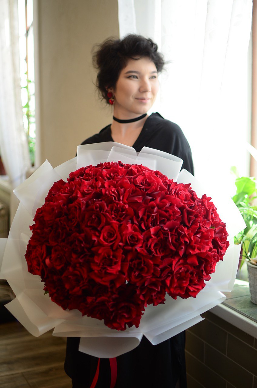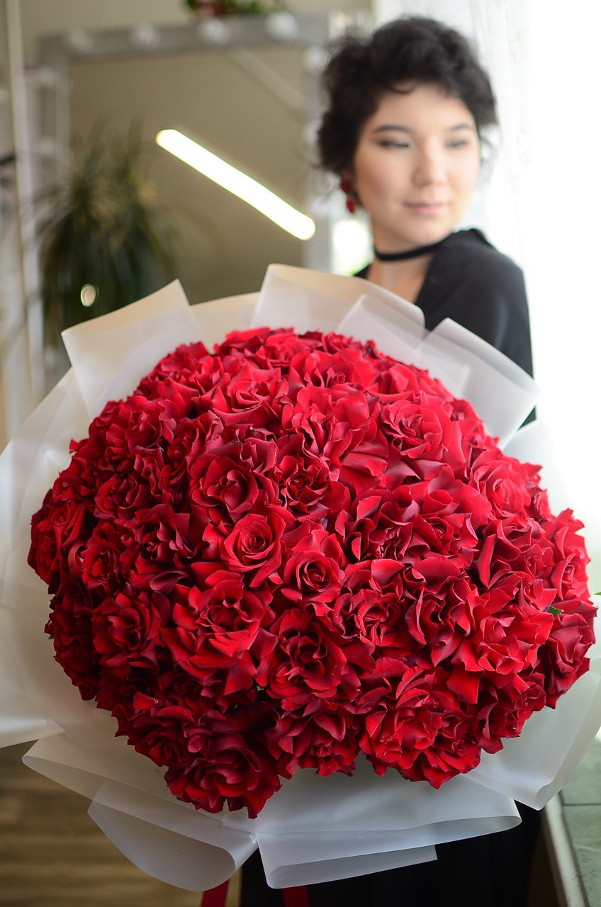 Потрясающий и очень объемный букет  из 51-ой крупной бордовой французской розы в дизайнерском оформлении.