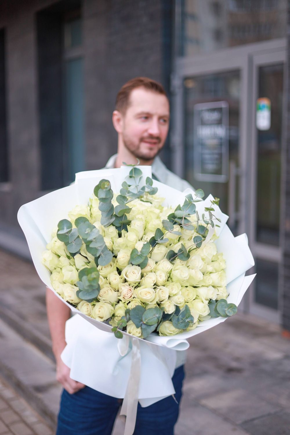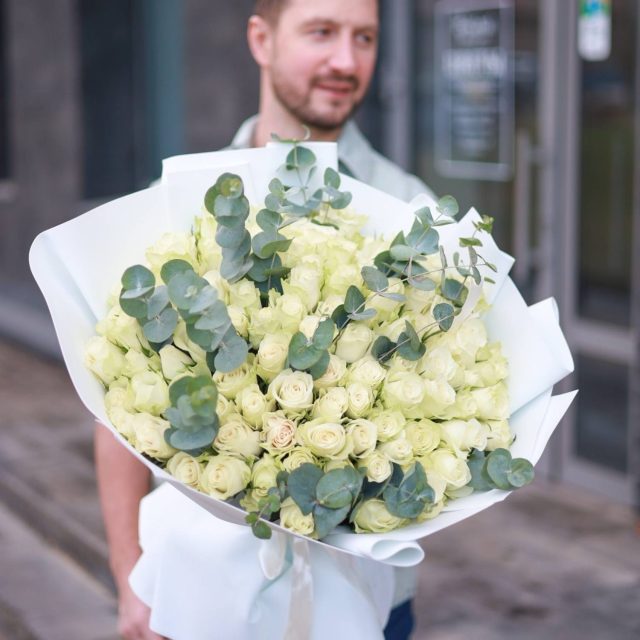 Большой букет изысканных белых роз с эвкалиптом