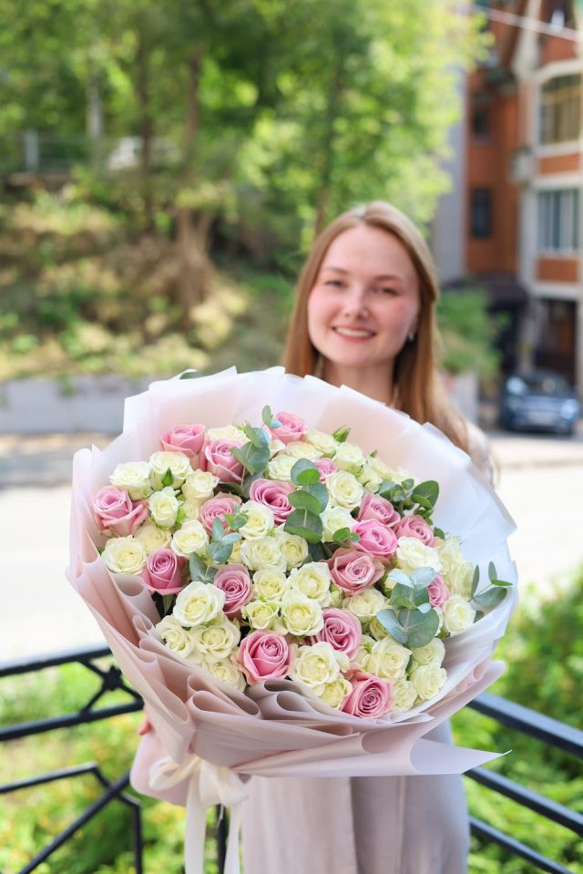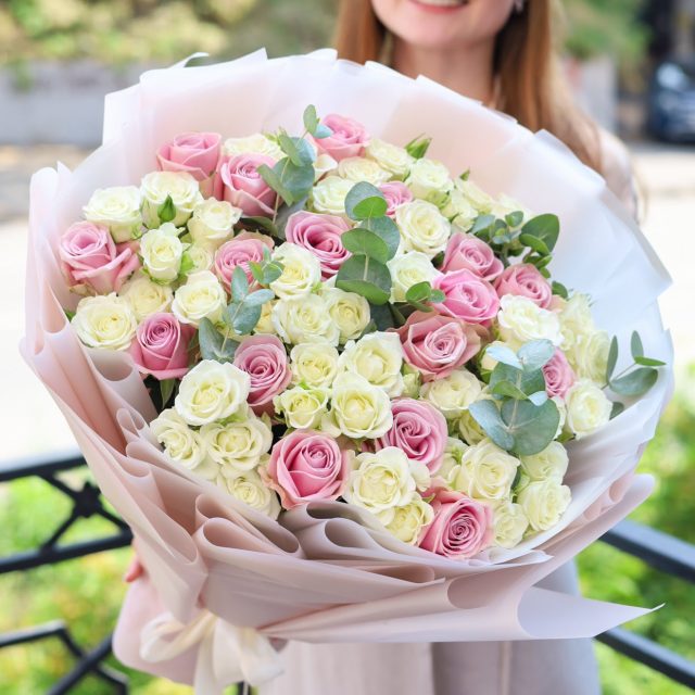 Прекрасный объемный букет белых кустовых роз, розовых одноголовых роз и душистого эвкалипта.