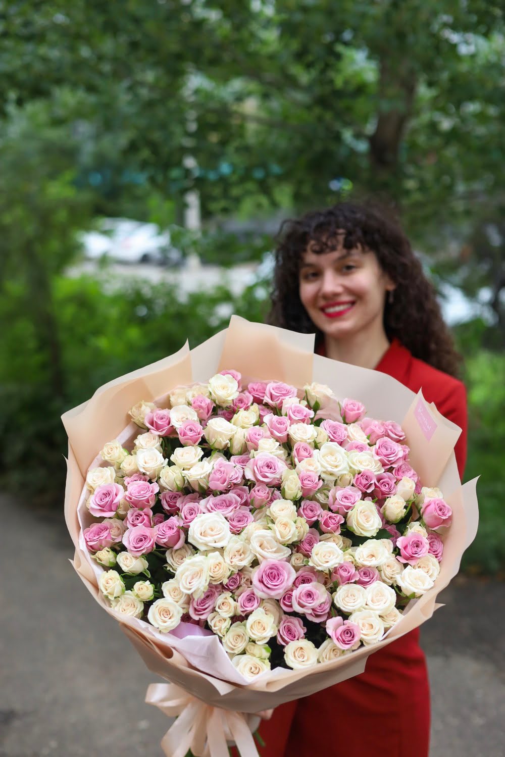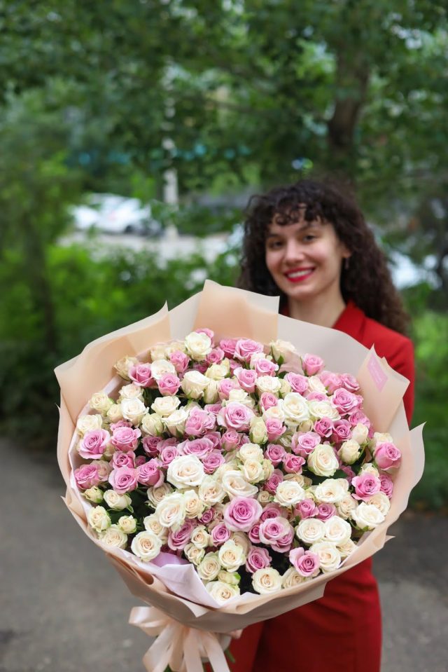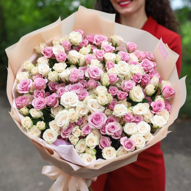 Роскошный объемный букет кустовых роз микс. Такой букет подарит самые приятные впечатления и запомнится надолго!