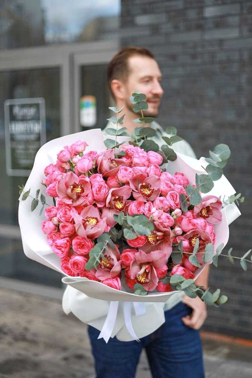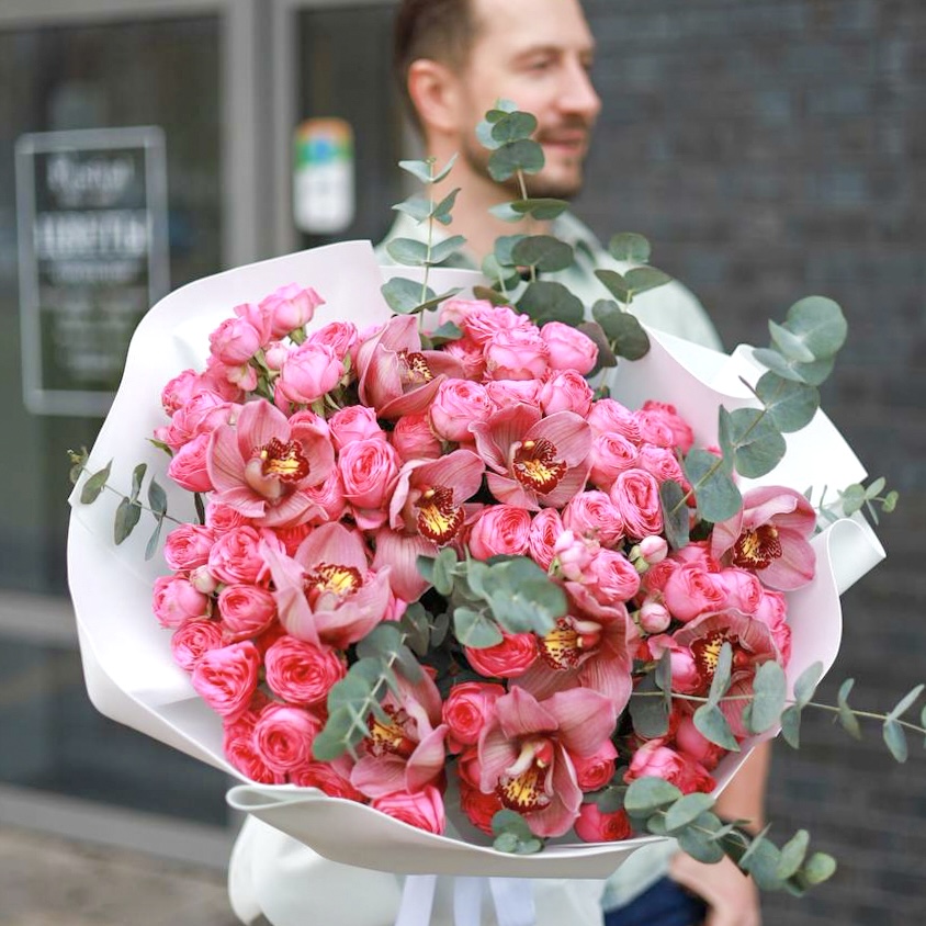 Состав: крупные кустовые пионовидные розы, стойкие ароматные орхидеи, душистый эвкалипт.