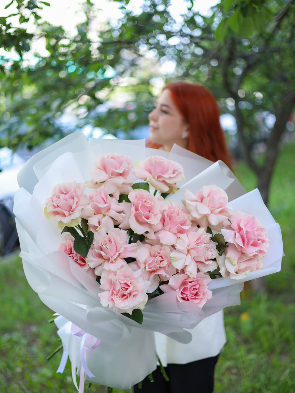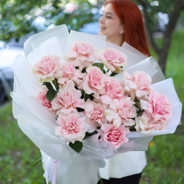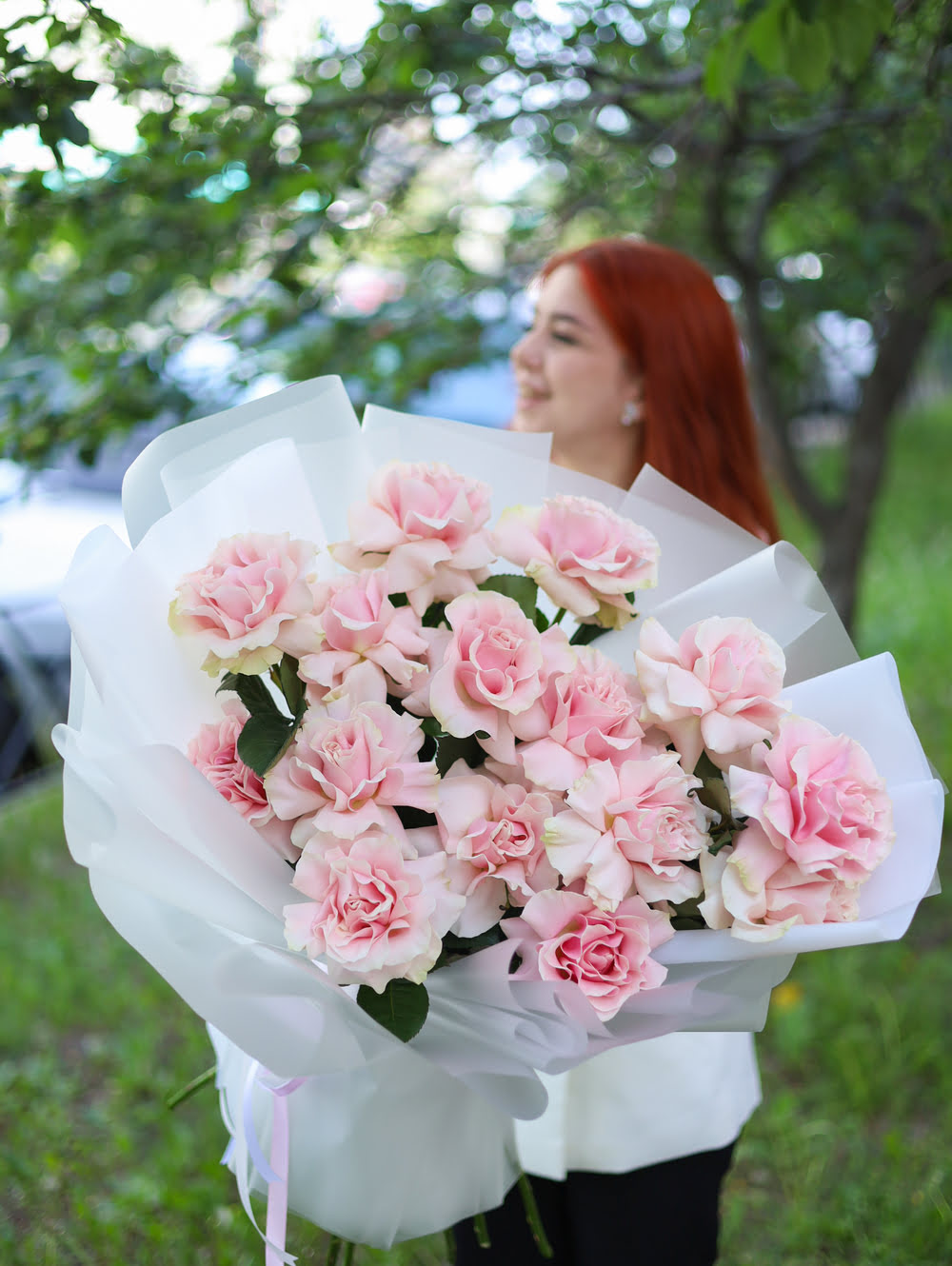 Великолепный объемный букет из 15-ти крупных французских роз нежно-розового цвета. Букет оформлен в корейскую пленку.