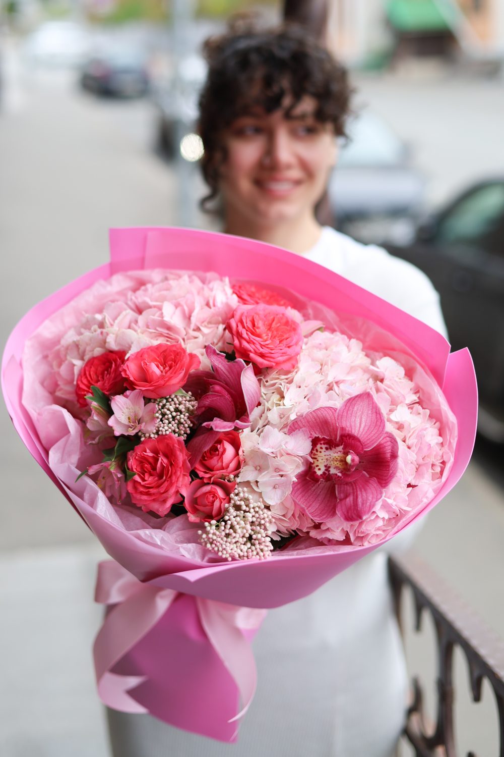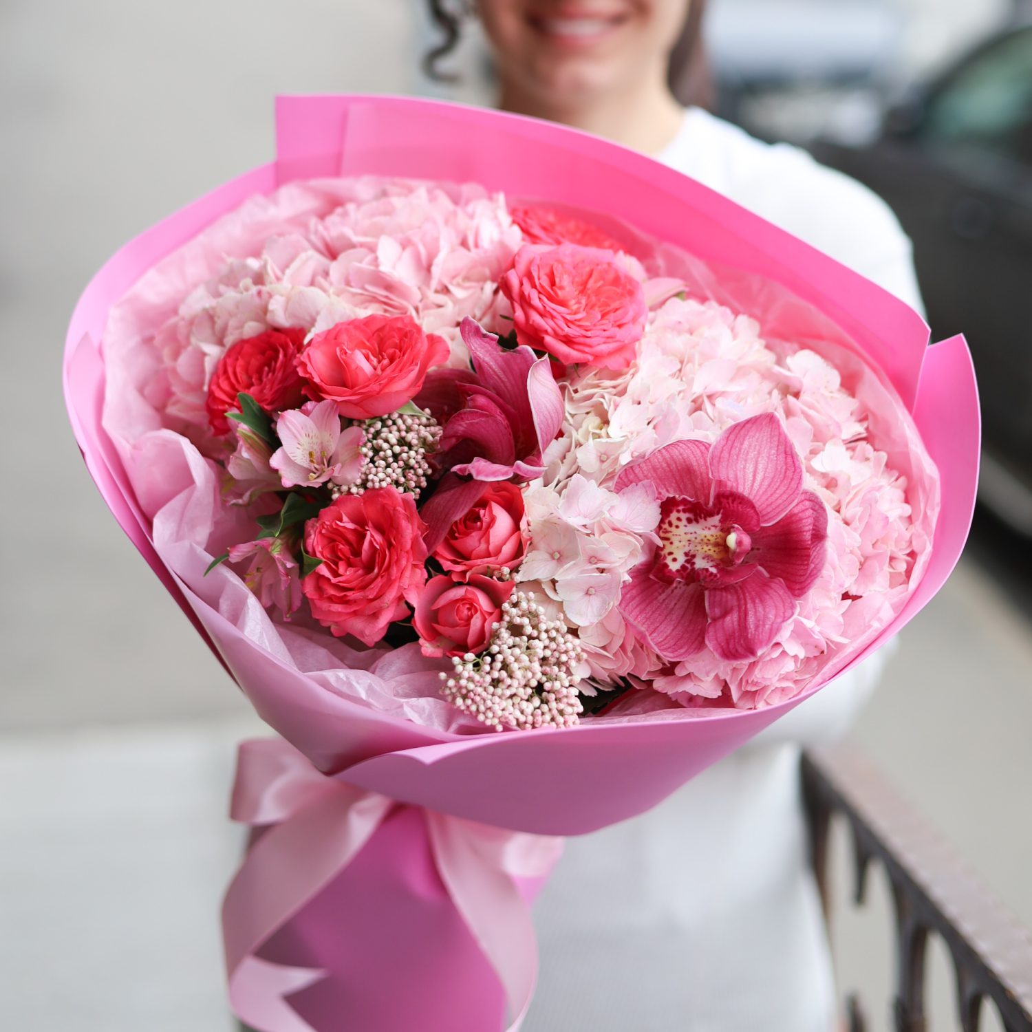 Прекрасный букет в розово-лавандовой гамме в дизайнерском оформлении.