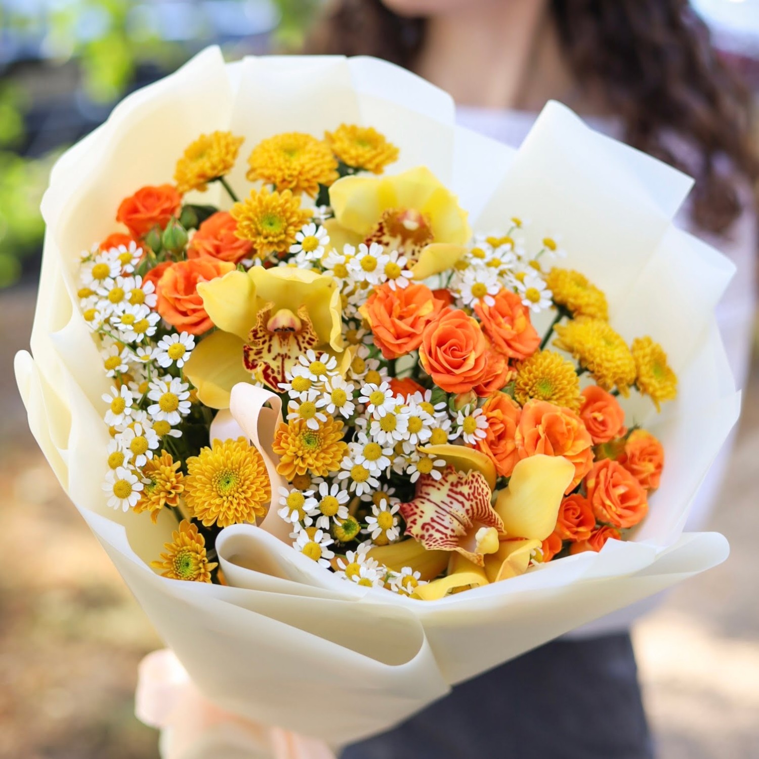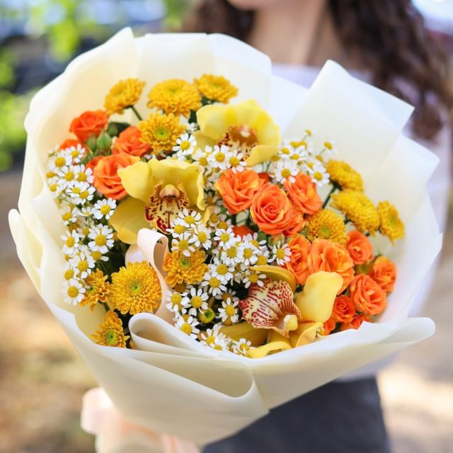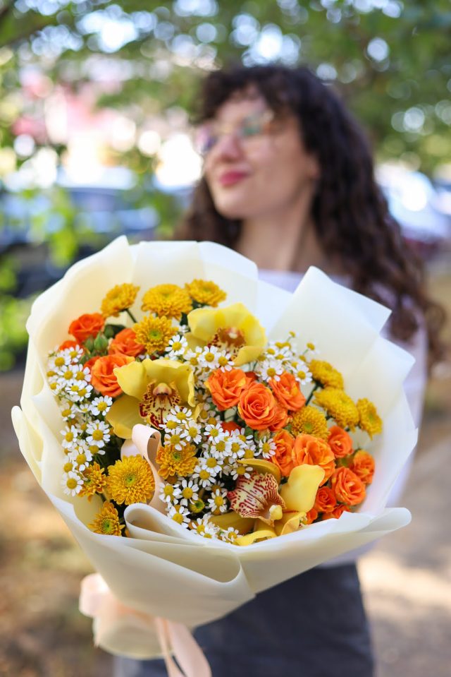 В букете: кустовые розы, ароматные ромашки, стойкая хризантема Сантини и орхидеи.