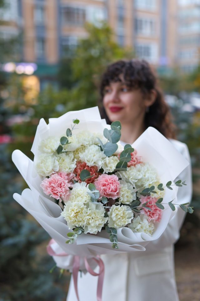 Очаровательный объемный букет из 25-ти диантусов микс с душистым эвкалиптом.