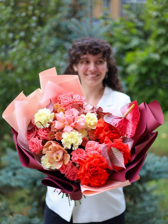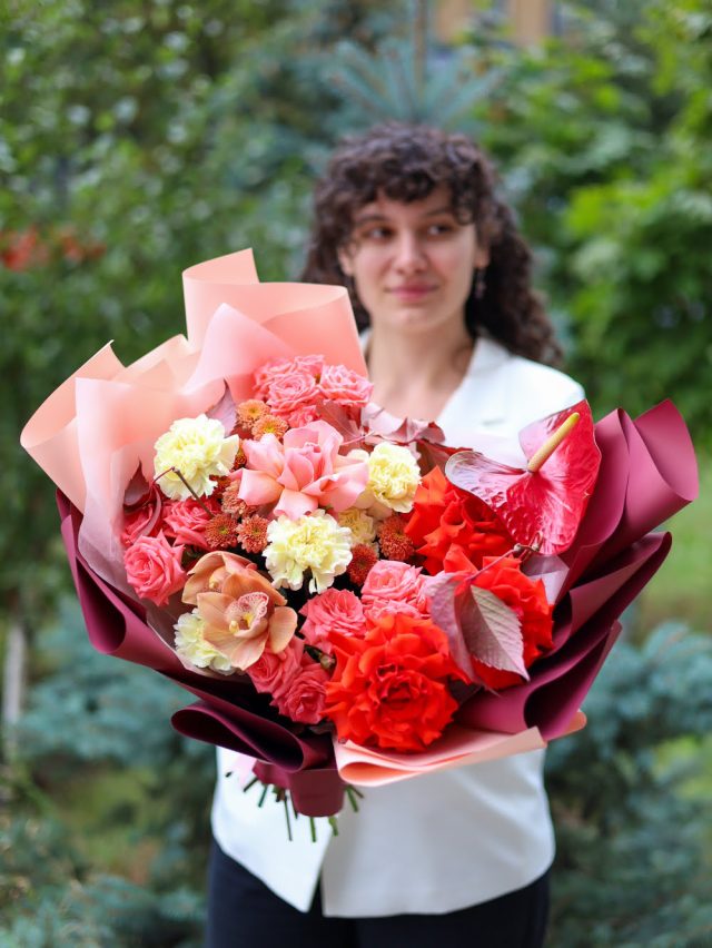 Состав: экзотический антуриум, крупные французские розы, стойкие диантусы, хризантема и орхидеи, кустовые розы, зелень.