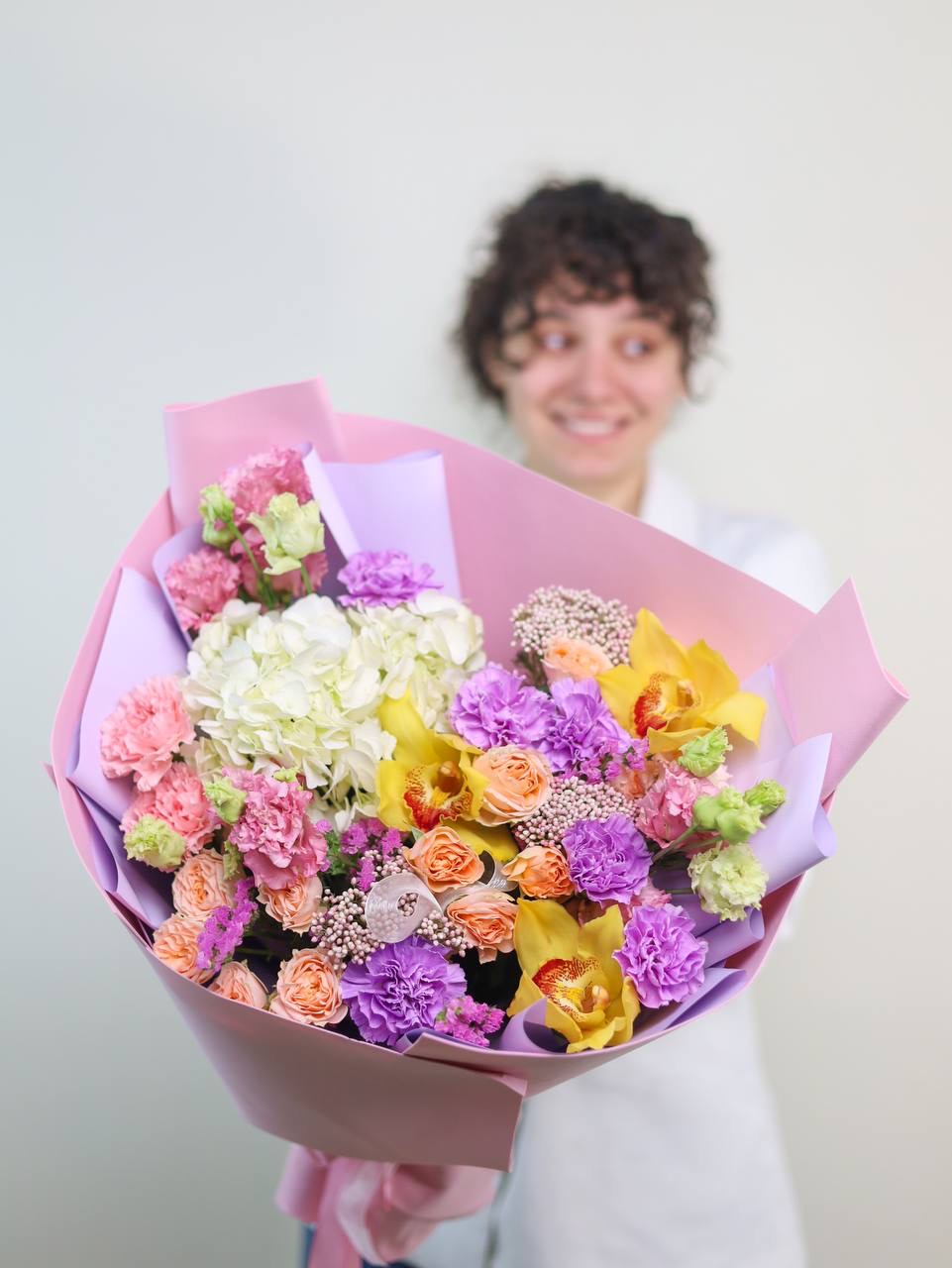 Состав: стойкие диантусы и орхидеи, нежная гортензия, эустома, кустовые пионовидные розы, озотамнус, статица.