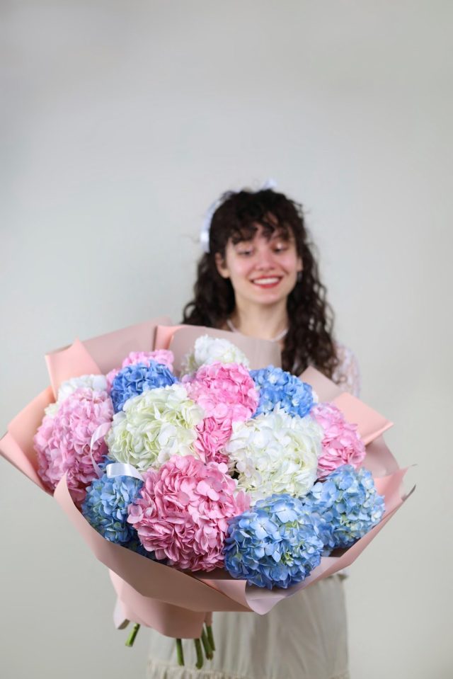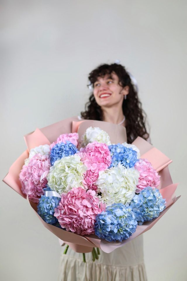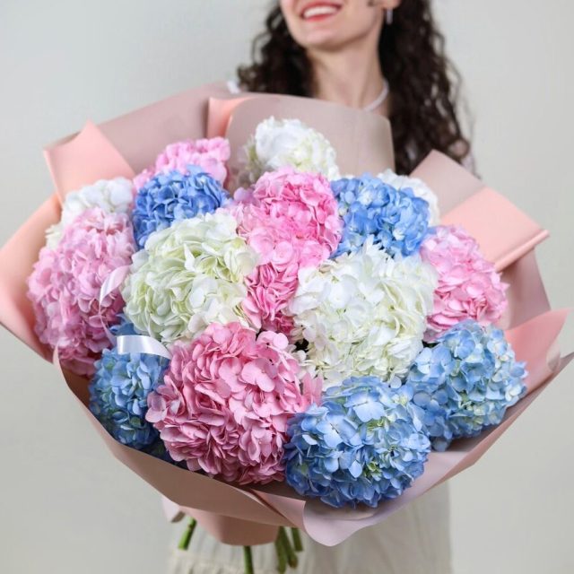 Большой и роскошный букет из 15-ти пышных гортензий.
