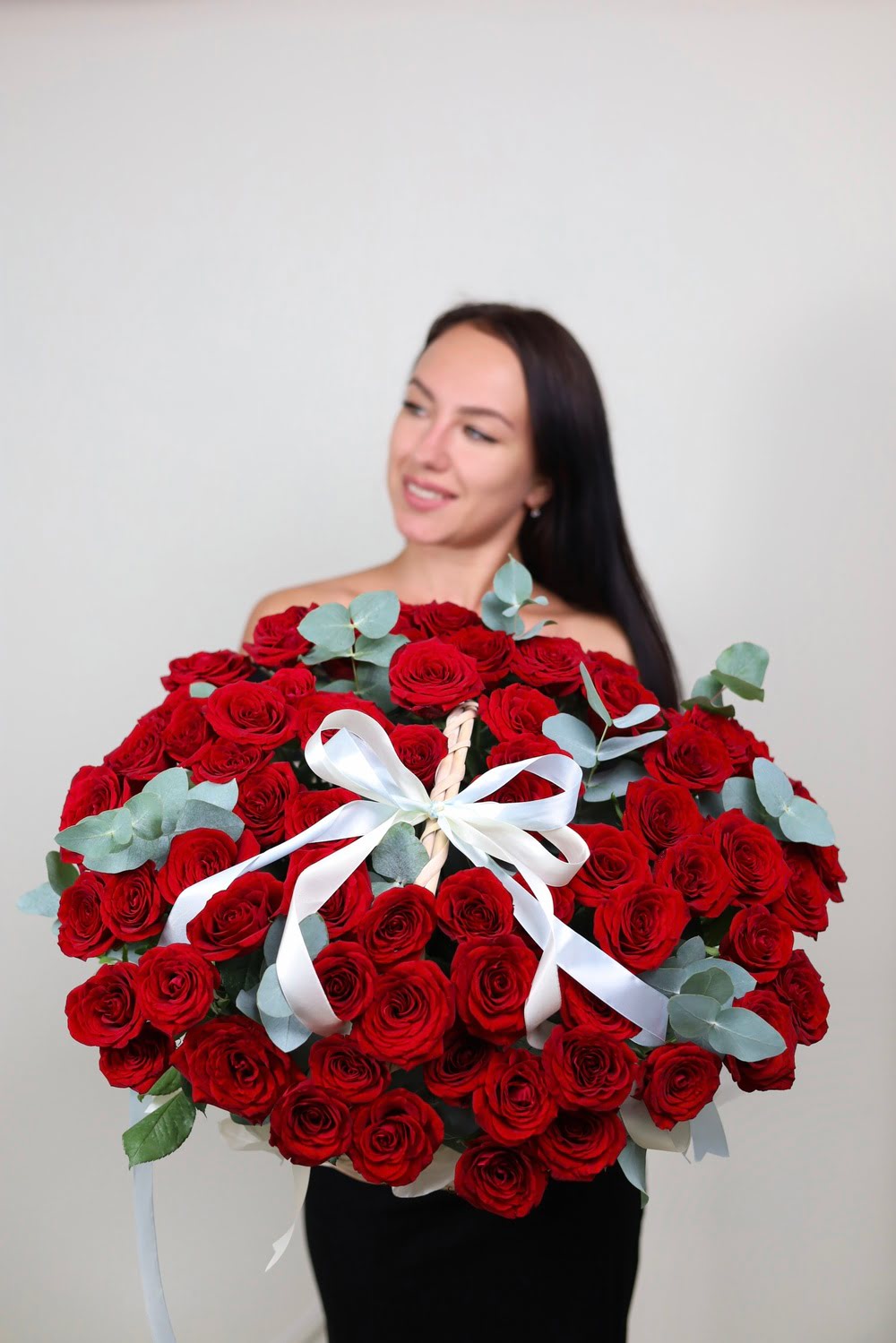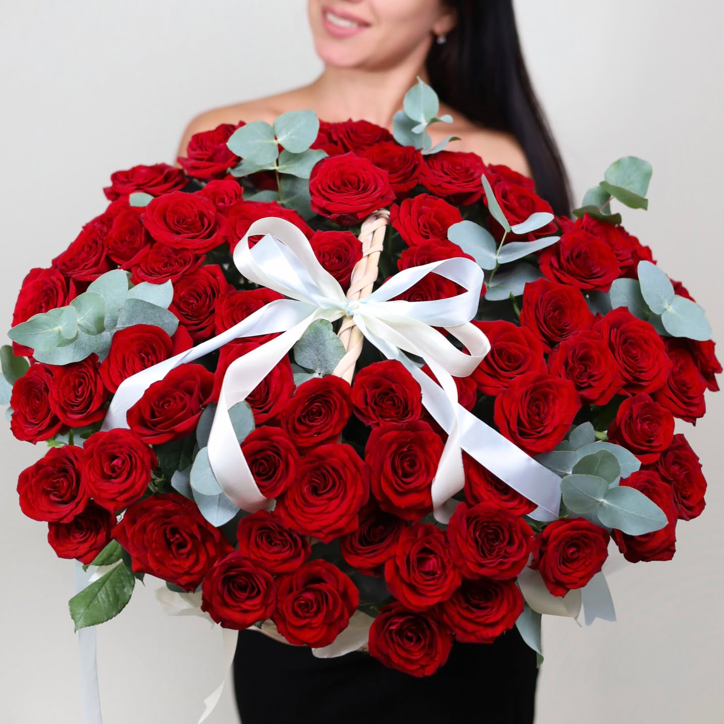 Роскошная композиция из 101-ой красной розы с душистым эвкалиптом в плетеной корзине.