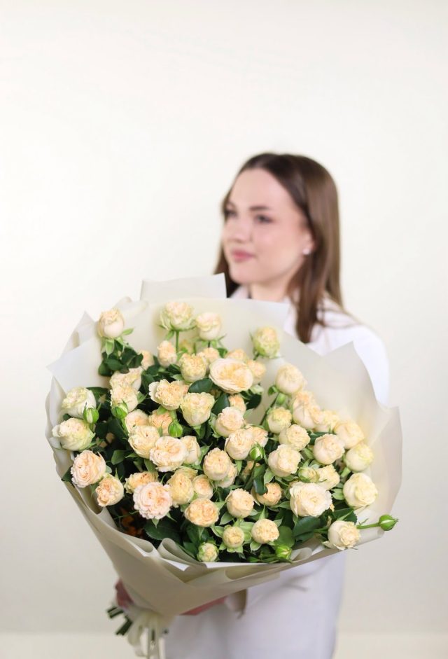 Большой роскошный букет пионовидных кустовых роз кремового оттенка в оформлении.