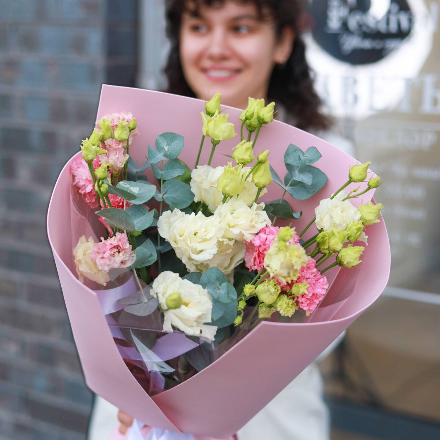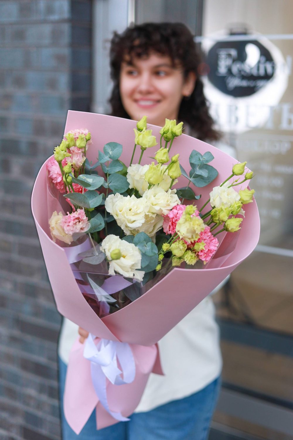 Очаровательный воздушный букет эустомы микс с душистым эвкалиптом в оформлении.
