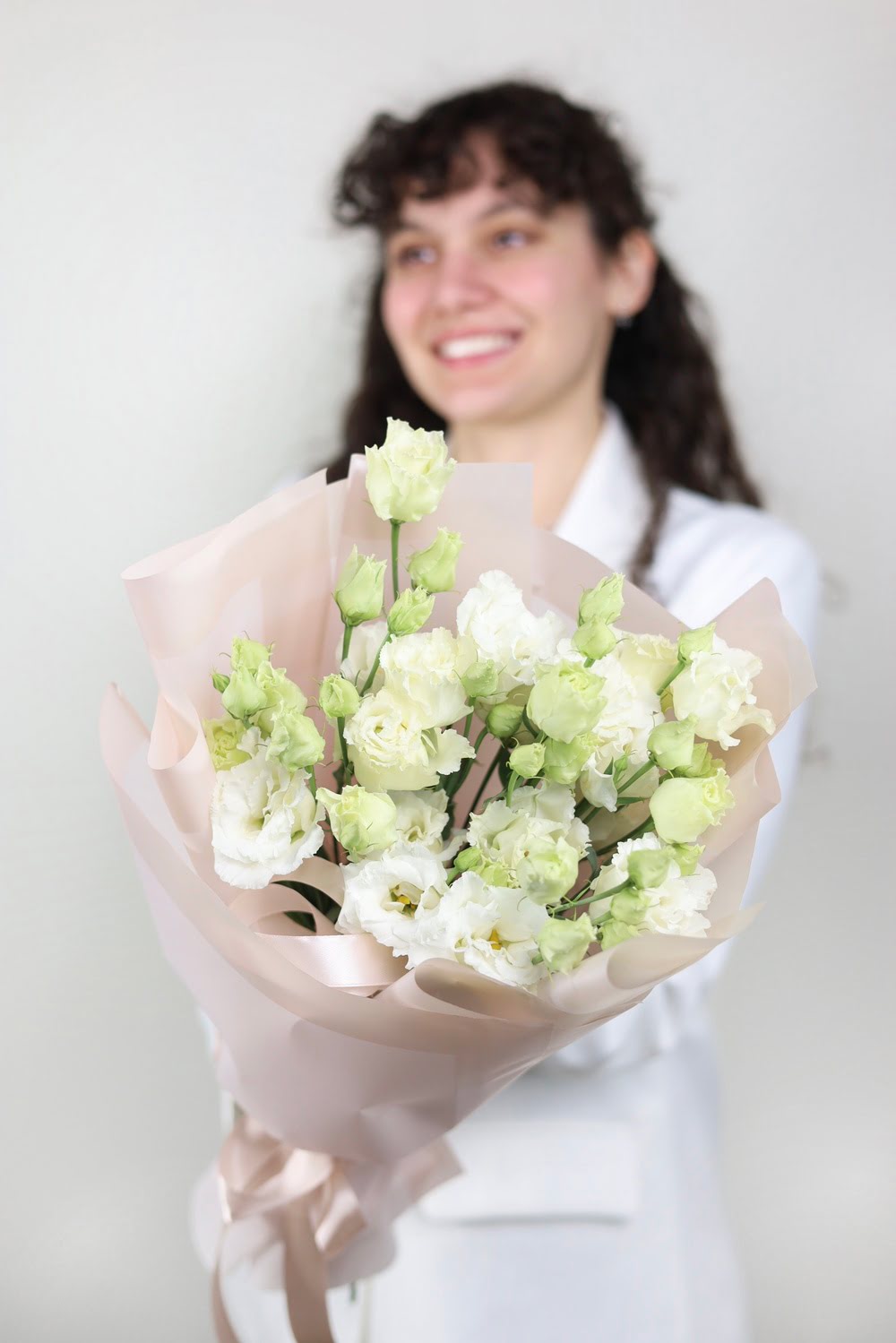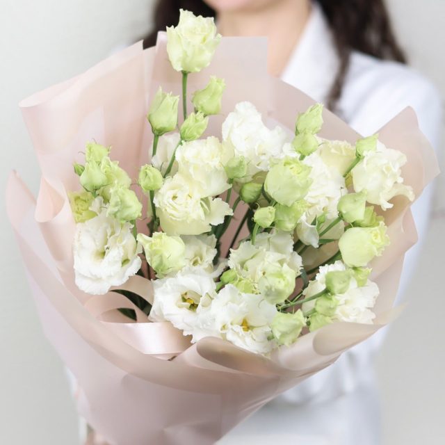 Букет белой эустомы в оформлении