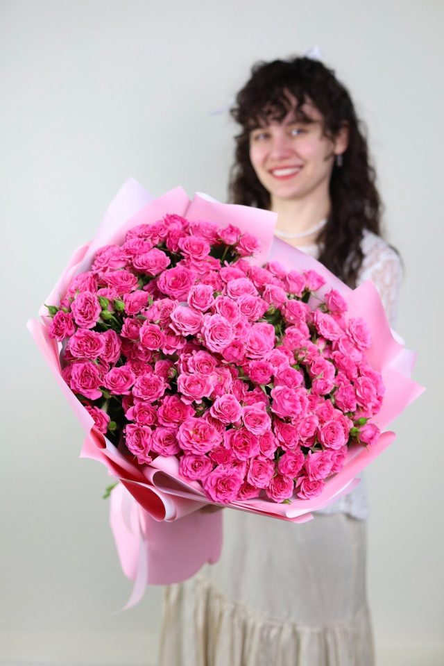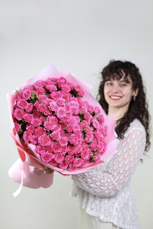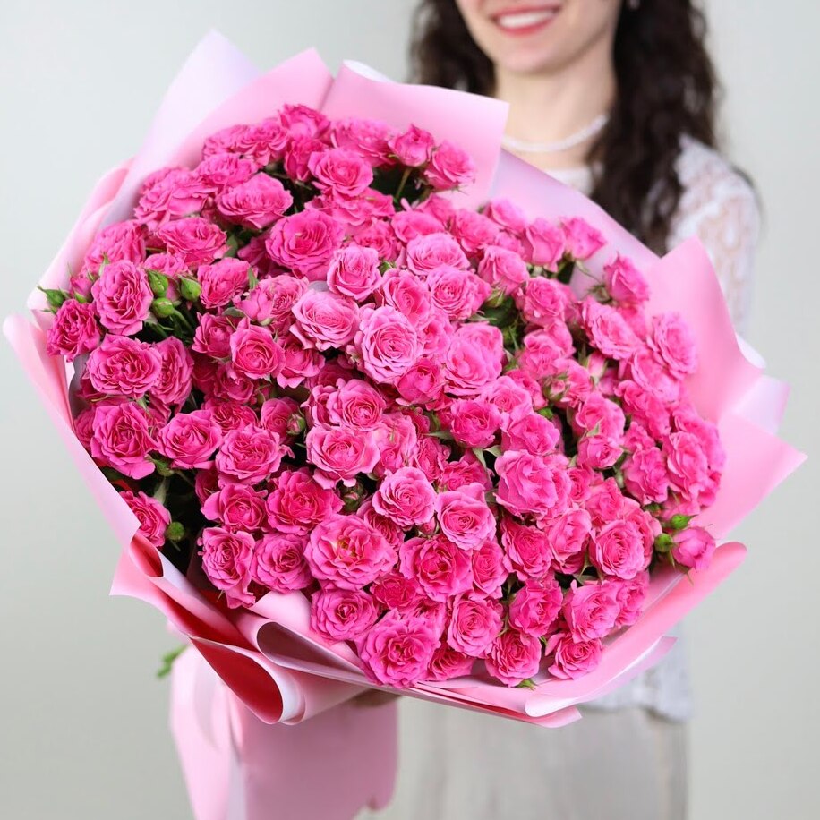 Прекрасный букет кустовой розы красивого розового (малинового) оттенка. Букет оформлен в корейскую пленку и украшен атласными лентами.
