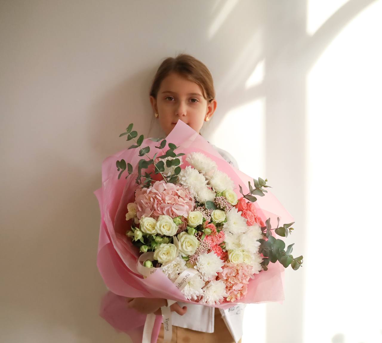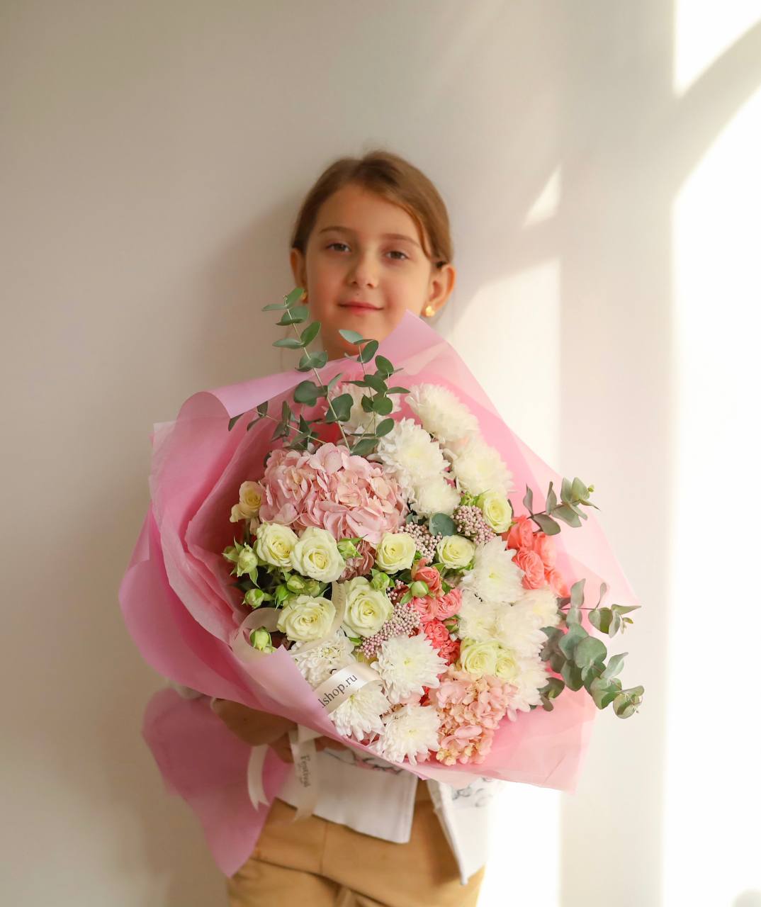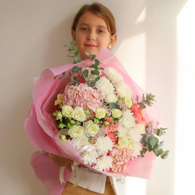 В букете: пышные гортензии, кустовые розы, хризантема, озотамнус, душистый эвкалипт.