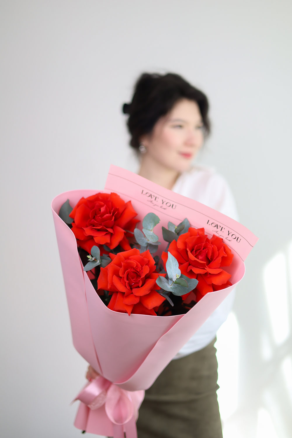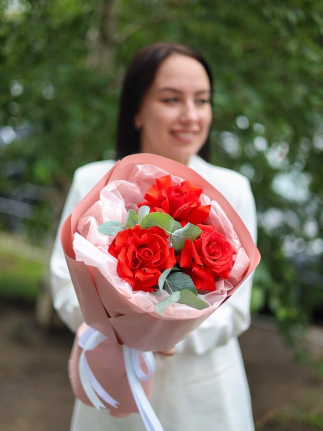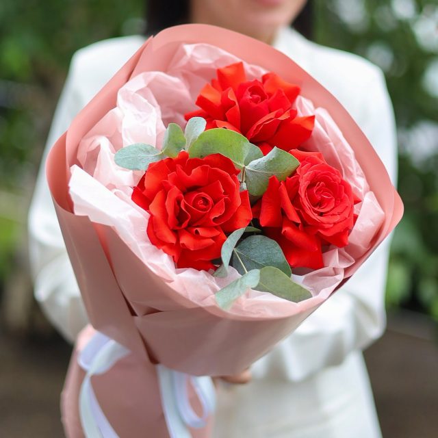 Стильный букет из 3-х красных французских роз с душистыми эвкалиптом.