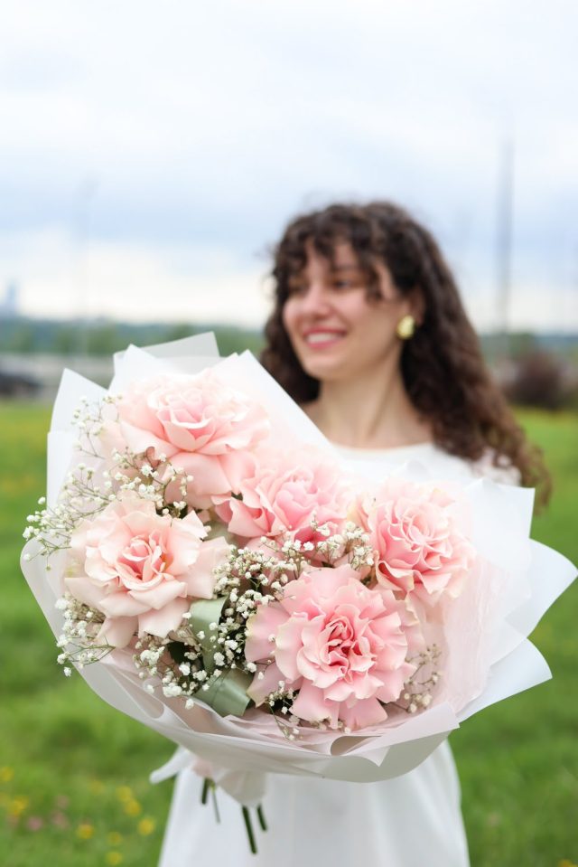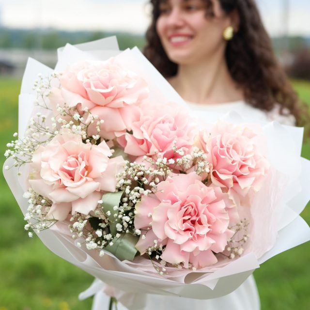 Воздушный букет с нежными французскими розами и стойкой гипсофилой в оформлении.