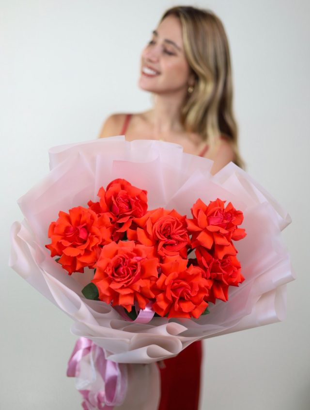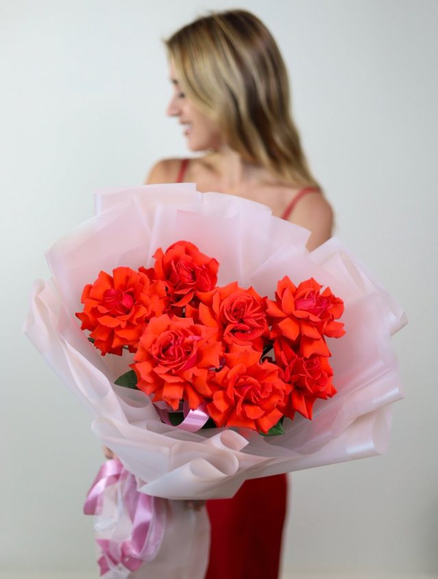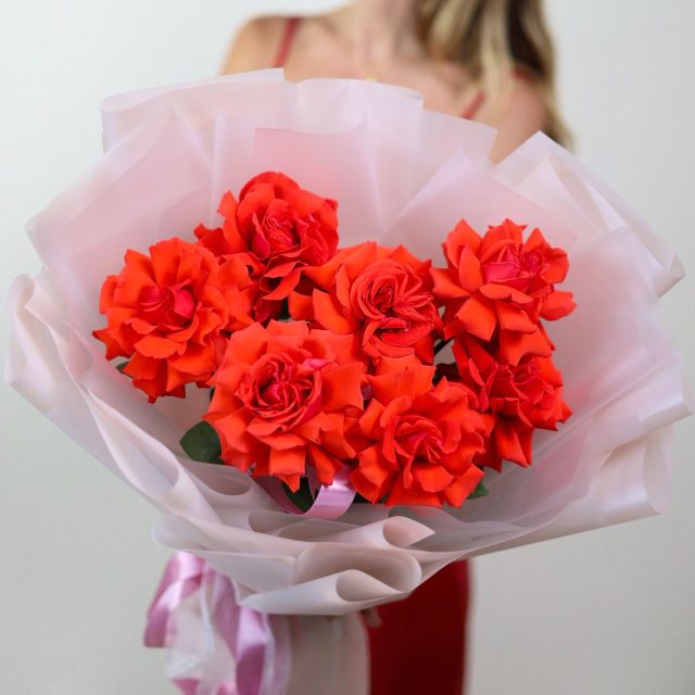 Красивый букет из 7-ми крупных роз алого оттенка в оформлении, сорт Нина.