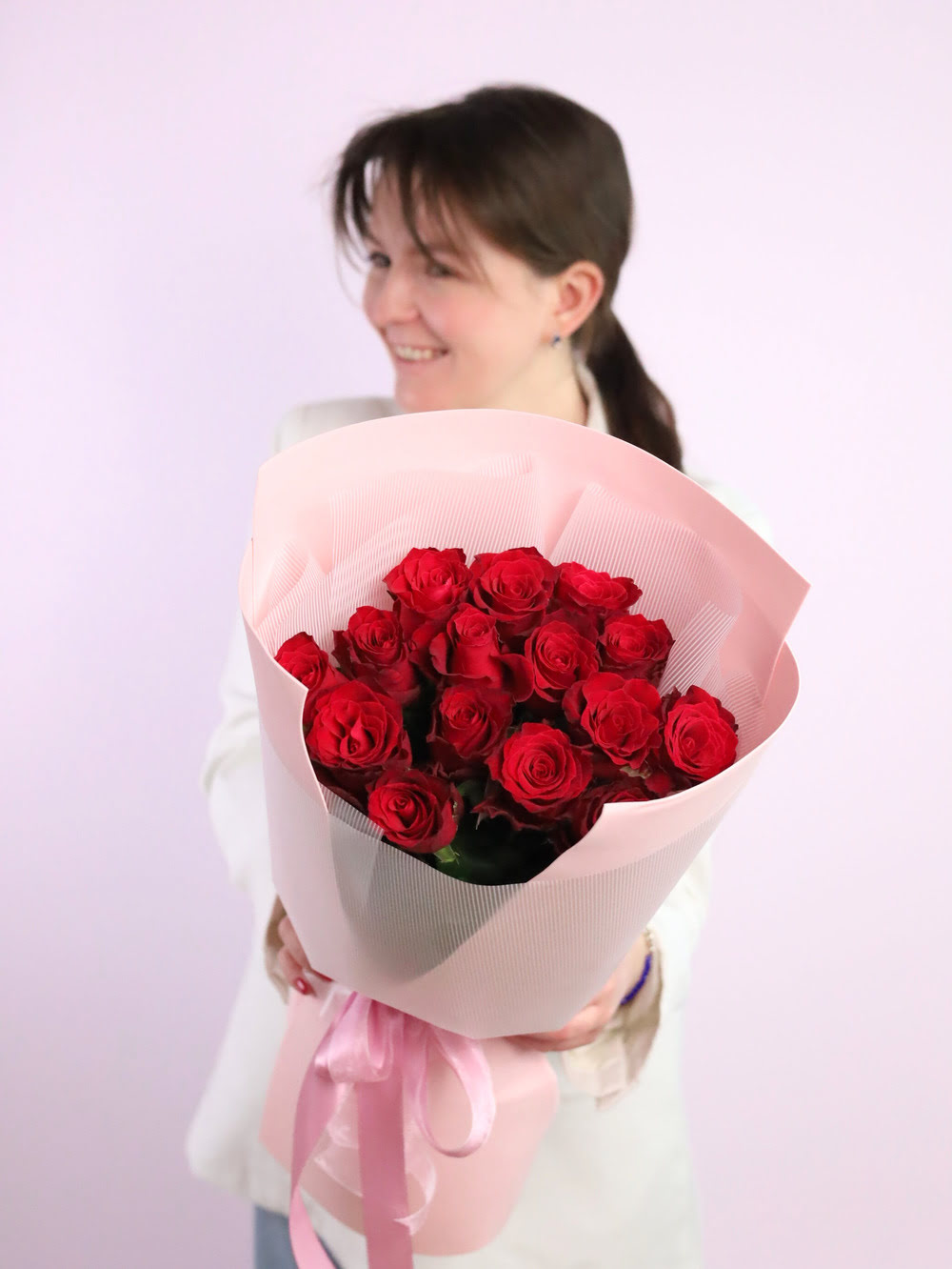 Прекрасный букет из 15-ти красных роз в оформлении.