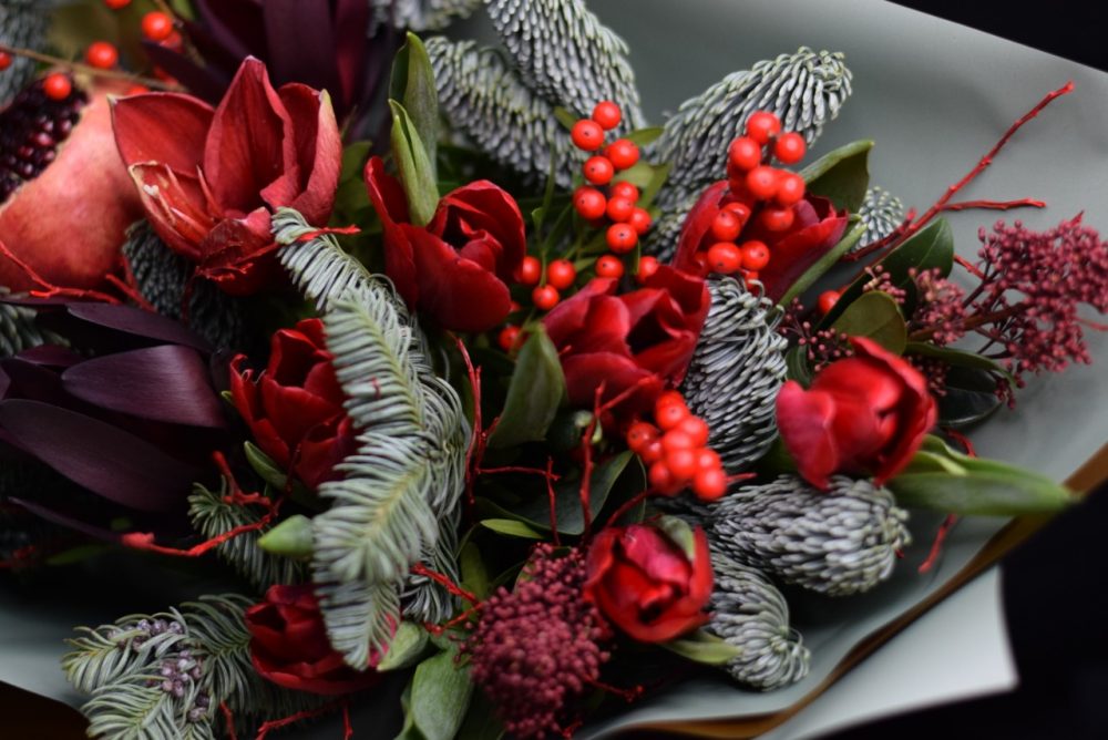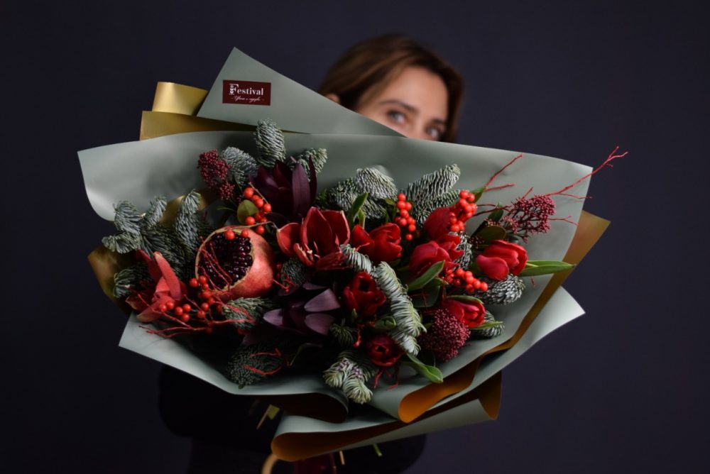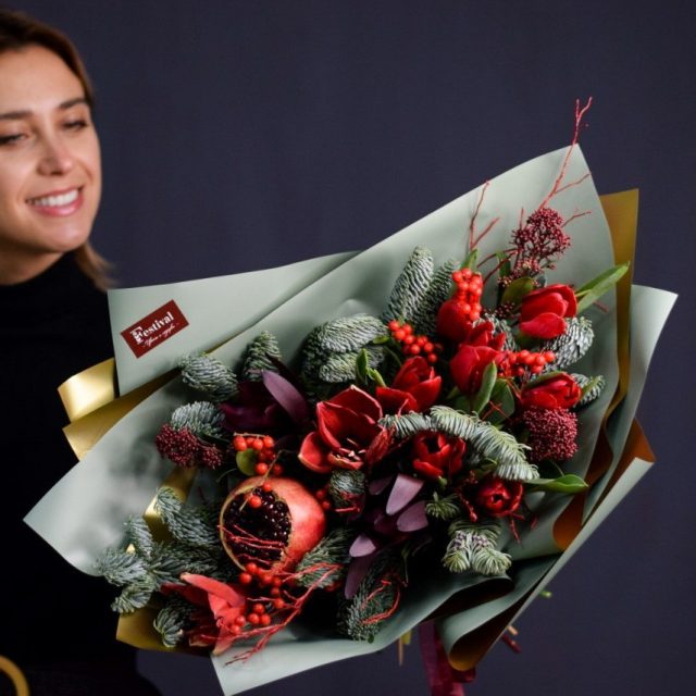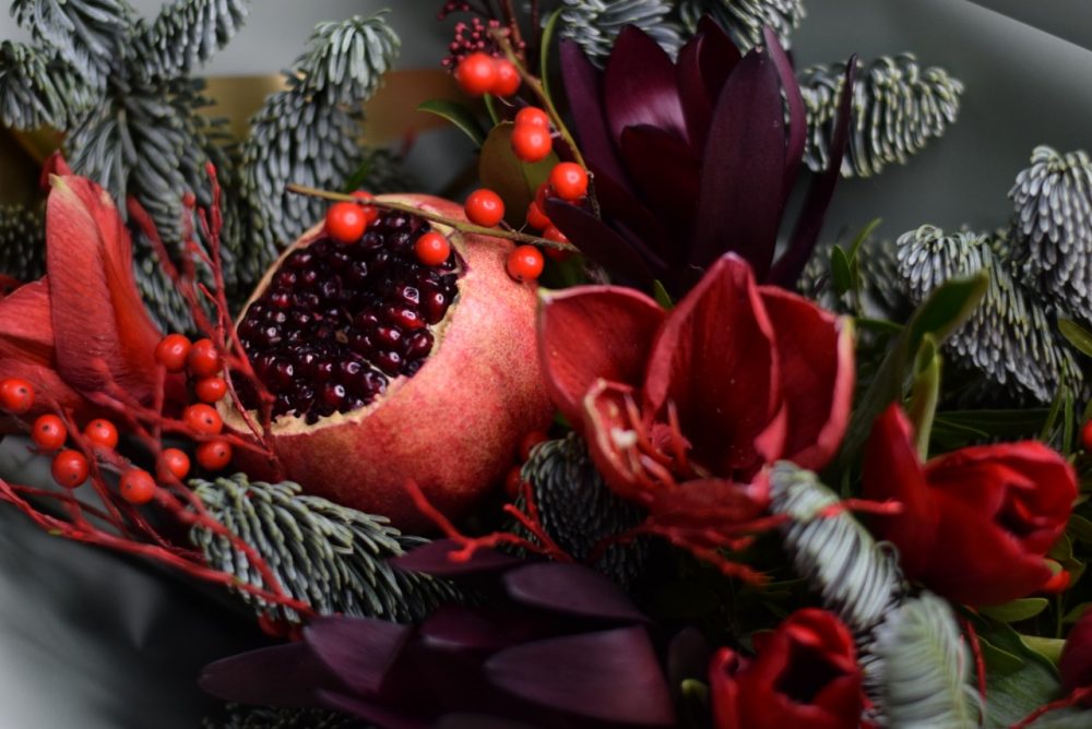 Яркий букет из зимней коллекции с гранатом, тюльпанами, розами и другими декоративными цветами.