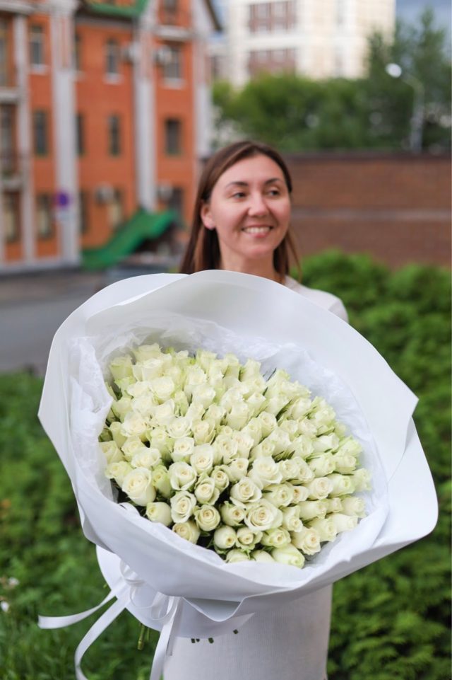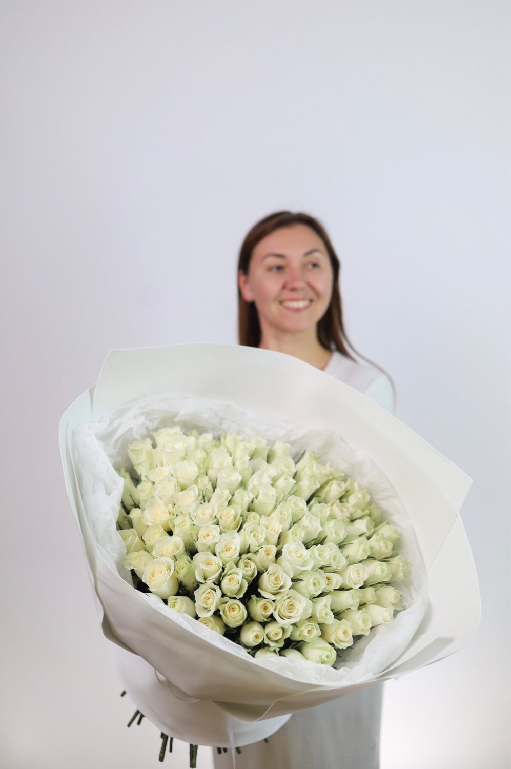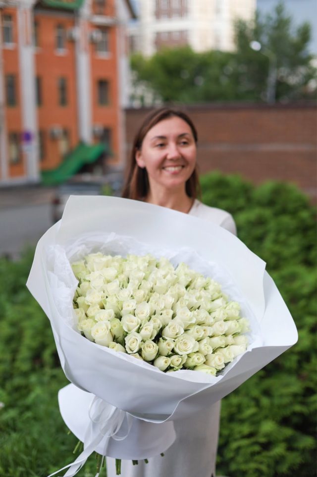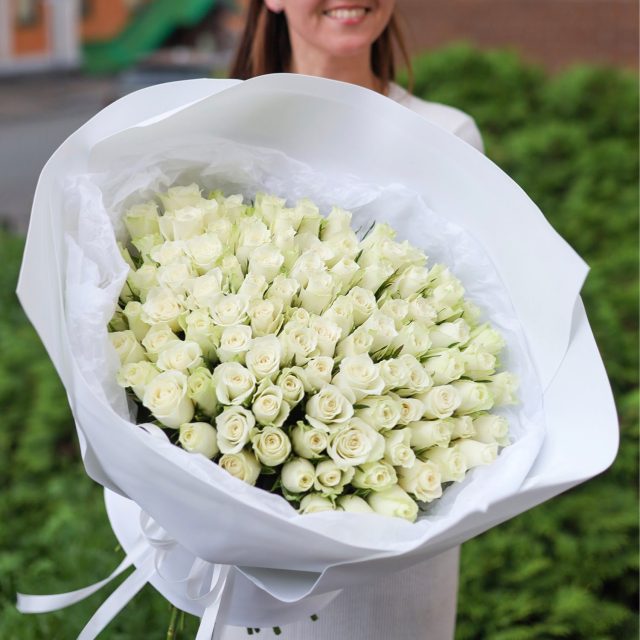 Роскошный большой букет из 101-ой белой розы в стильном оформлении.