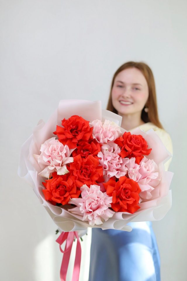 Великолепный букет из алых и розовых французских роз микс. В букете 11 роз.