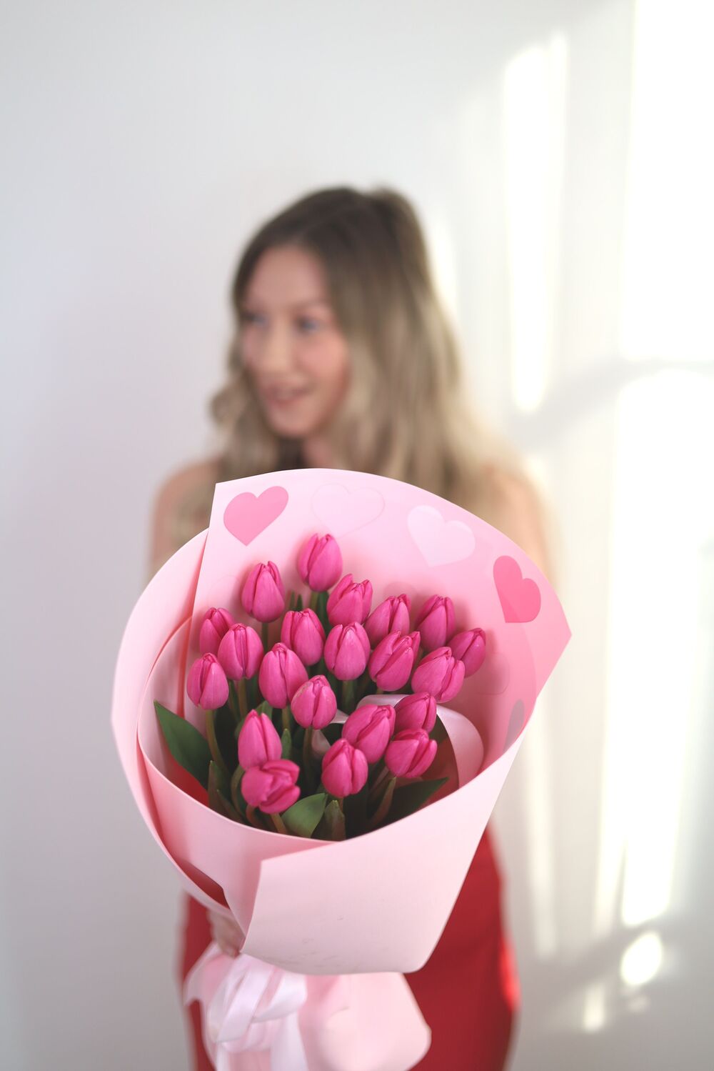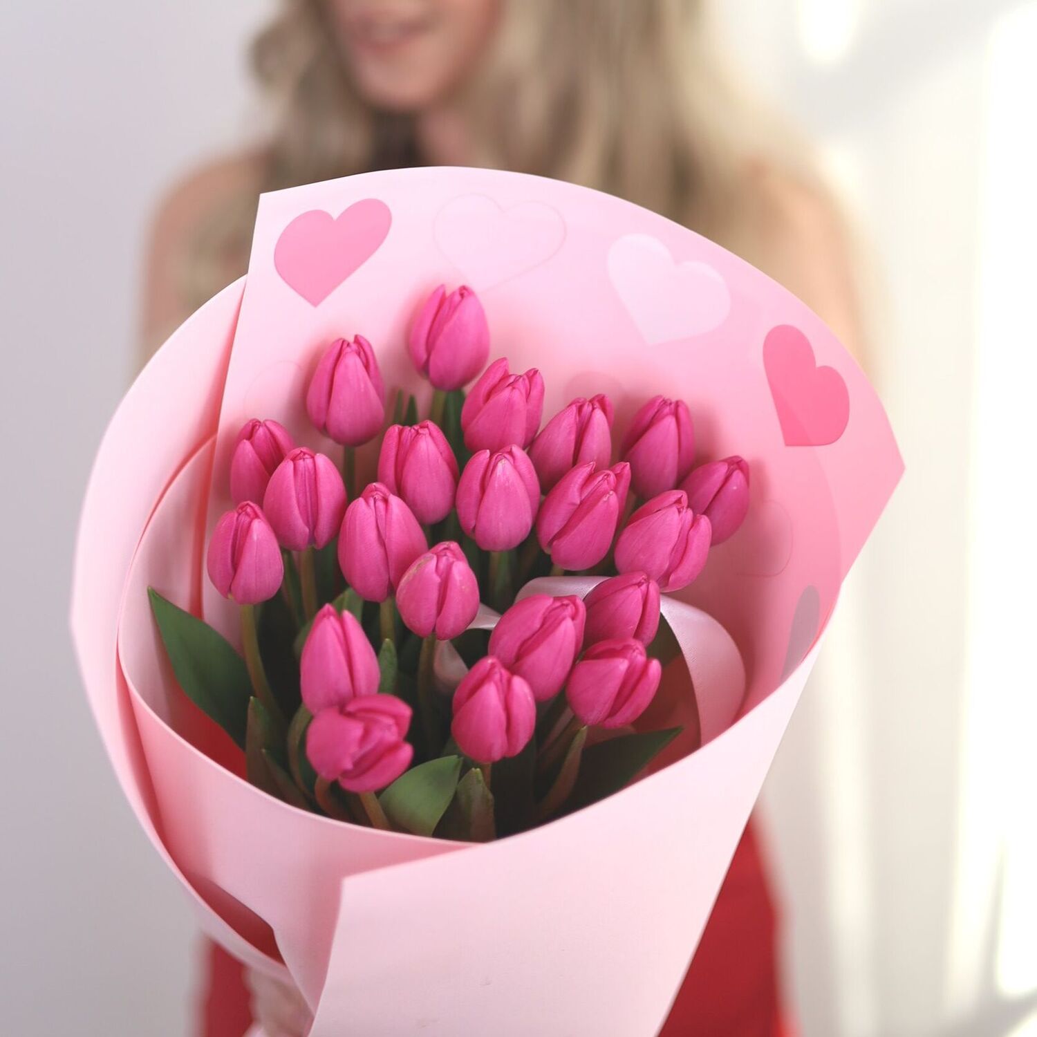 Высота букета 40-45 см. Оттенок тюльпанов может отличаться от  светло — розового до сиреневого, малинового.