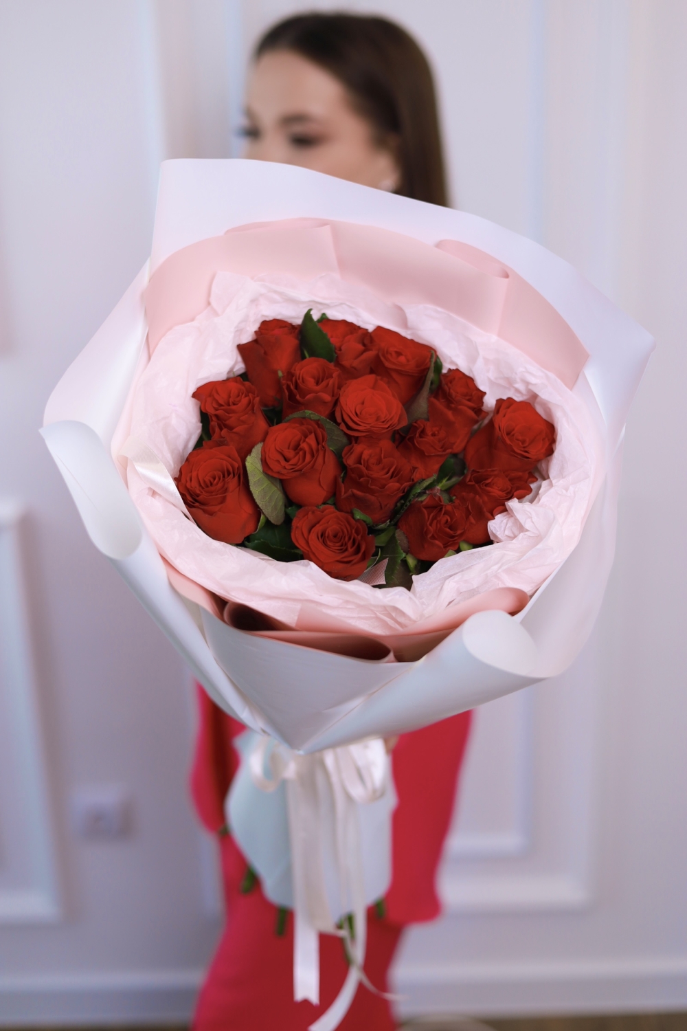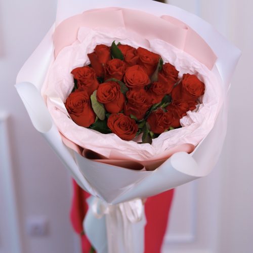 В составе букета розы насыщенно-красного оттенка в количестве 15шт.